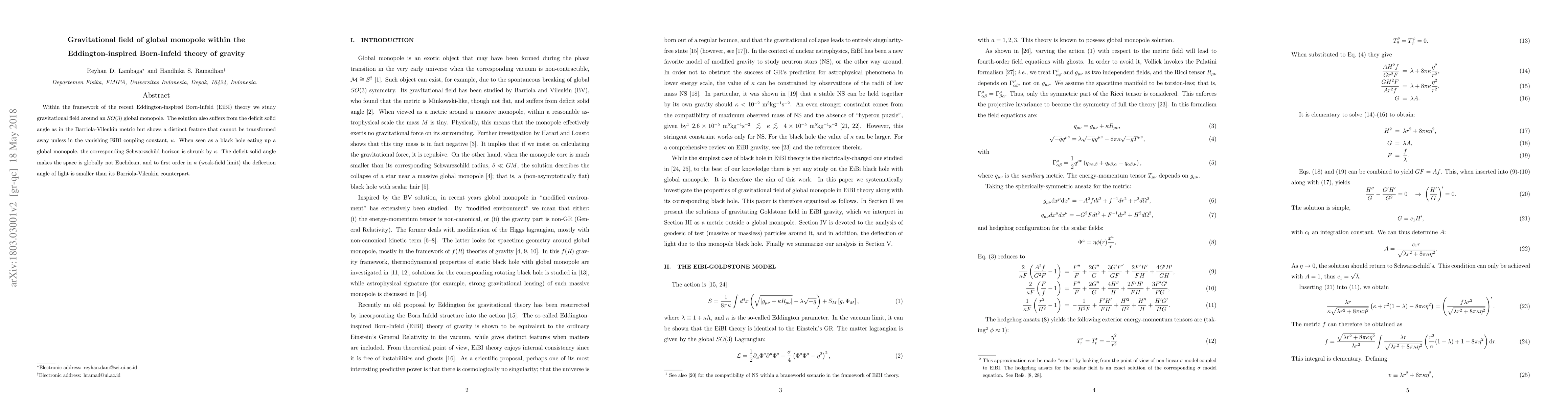 This research paper explores a global monopole within the Eddington-inspired Born-Infeld theory of gravity, finding that its gravitational field has a distinct feature not present in other solutions, with implications for black hole behavior and light deflection.