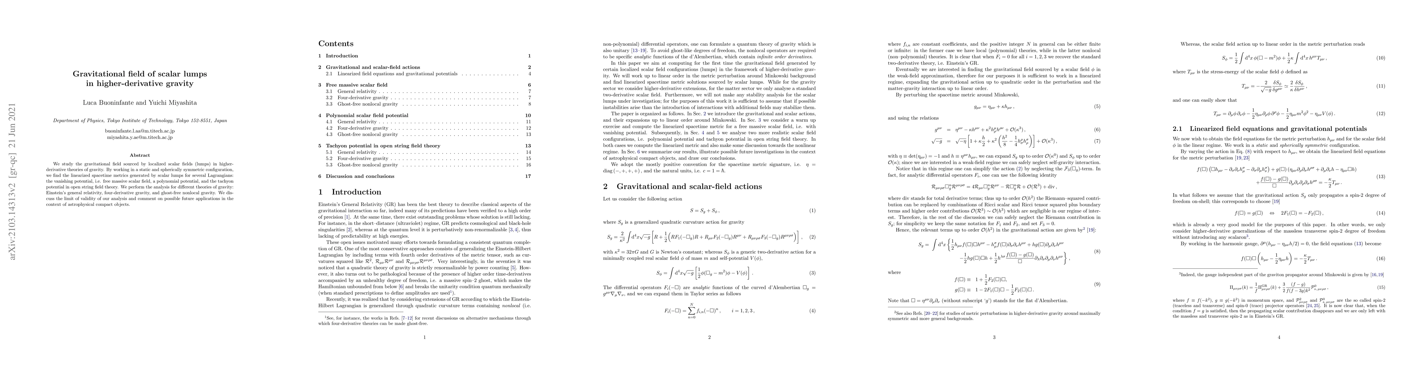 This paper investigates the gravitational field generated by localized scalar lumps in various higher-derivative gravity theories, including general relativity, four-derivative gravity, and ghost-free nonlocal gravity. It examines the spacetime metrics for different scalar field potentials and discusses the implications for astrophysical compact objects.