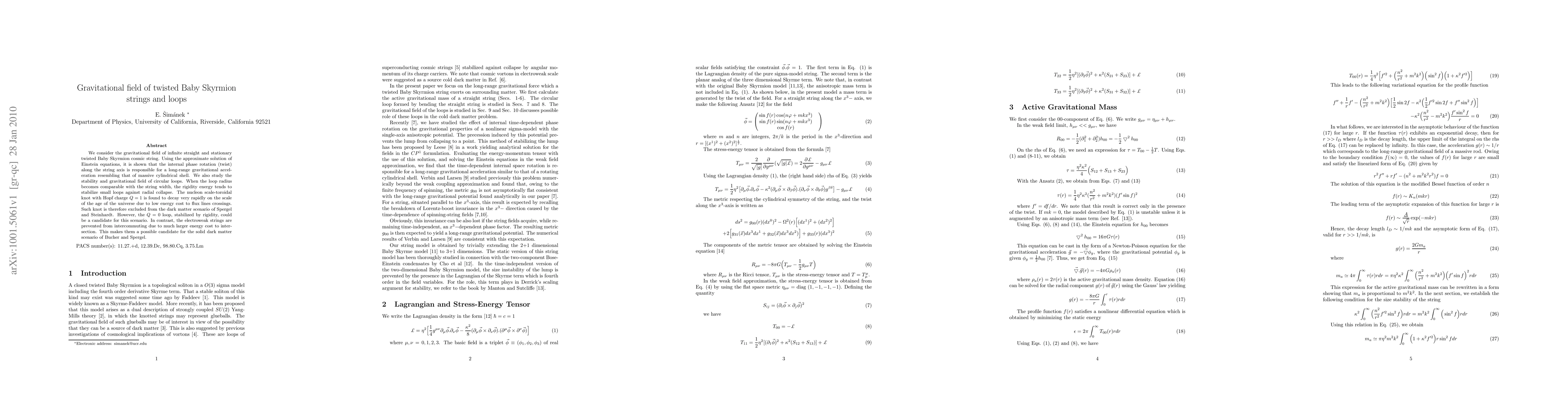 Researchers studied the gravitational fields of twisted Baby Skyrmion strings and loops, finding that a specific loop with zero twist could be a candidate for dark matter, while others decay rapidly due to low energy costs.