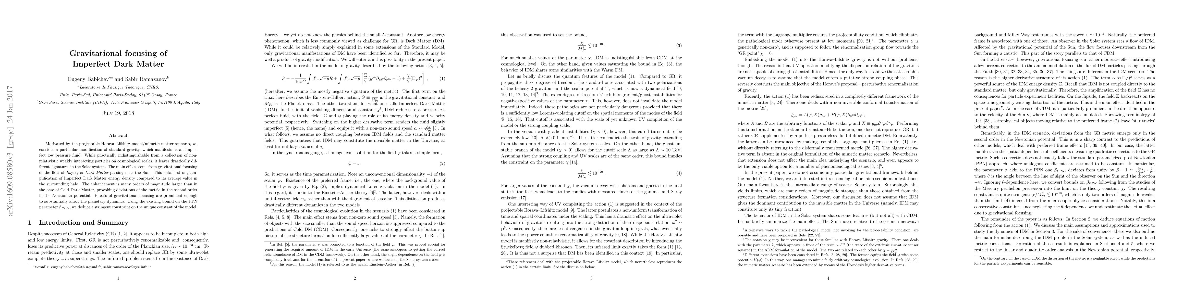Motivated by the projectable Horava--Lifshitz model/mimetic matter scenario, we consider a particular modification of standard gravity, which manifests as an imperfect low pressure fluid. While practically indistinguishable from a collection of non-relativistic weakly interacting particles on cosmological scales, it leaves drastically different signatures in the Solar system. The main effect stems from gravitational focusing of the flow of Imperfect Dark Matter passing near the Sun. This entails strong amplification of Imperfect Dark Matter energy density compared to its average value in the surrounding halo. The enhancement is many orders of magnitude larger than in the case of Cold Dark Matter, provoking deviations of the metric in the second order in the Newtonian potential. Effects of gravitational focusing are prominent enough to substantially affect the planetary dynamics. Using the existing bound on the PPN parameter $\beta_{PPN}$, we deduce a stringent constraint on the unique constant of the model.