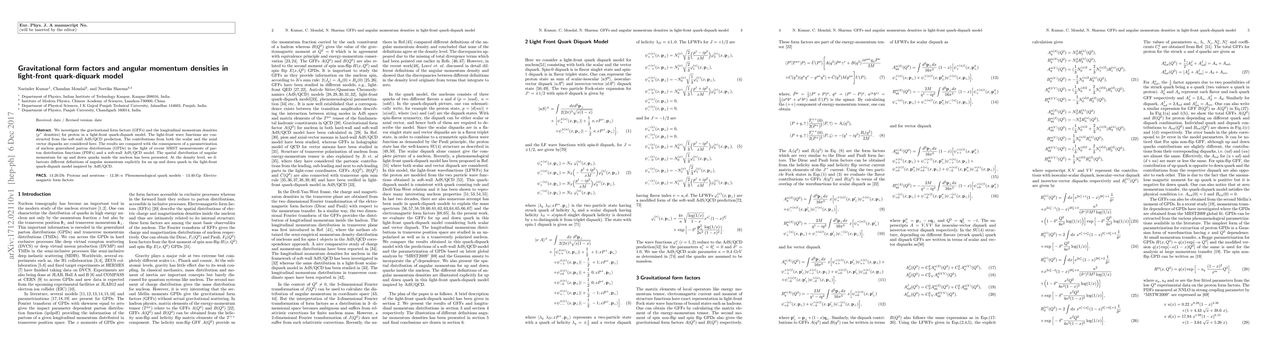 This paper examines gravitational form factors and longitudinal momentum densities for a proton using a light-front quark-diquark model, incorporating both scalar and axial vector diquarks. Results are compared with nucleon generalized parton distributions and recent MRST measurements, highlighting the spatial distribution of angular momentum for up and down quarks.