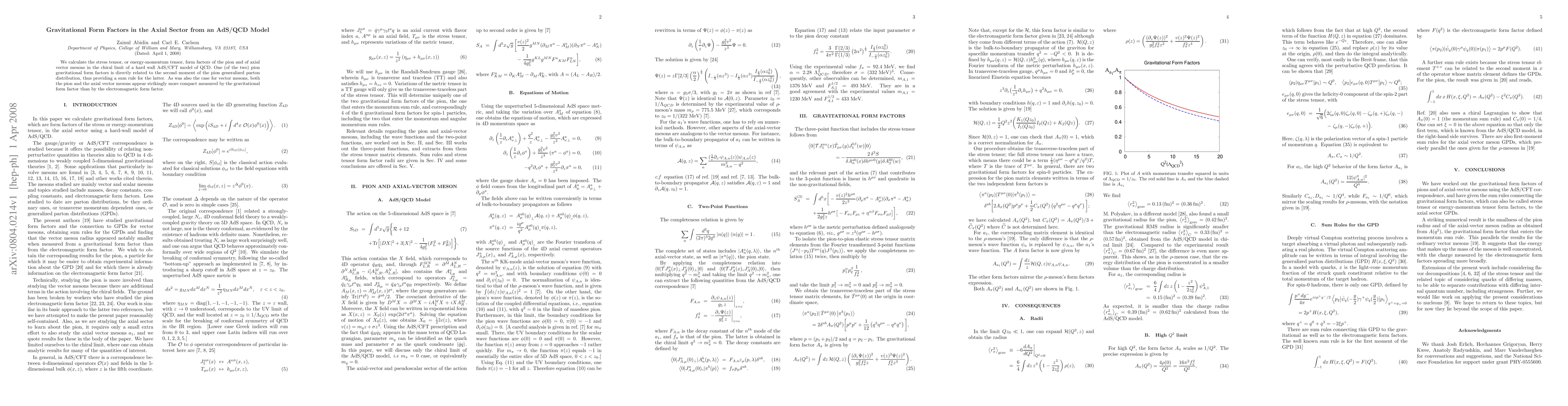 We calculate the stress tensor, or energy-momentum tensor, form factors of the pion and of axial vector mesons in the chiral limit of a hard wall AdS/CFT model of QCD. One (of the two) pion gravitational form factors is directly related to the second moment of the pion generalized parton distribution, thus providing a sum rule for the latter. As was also the case for vector mesons, both the pion and the axial vector mesons appear strikingly more compact measured by the gravitational form factor than by the electromagnetic form factor.