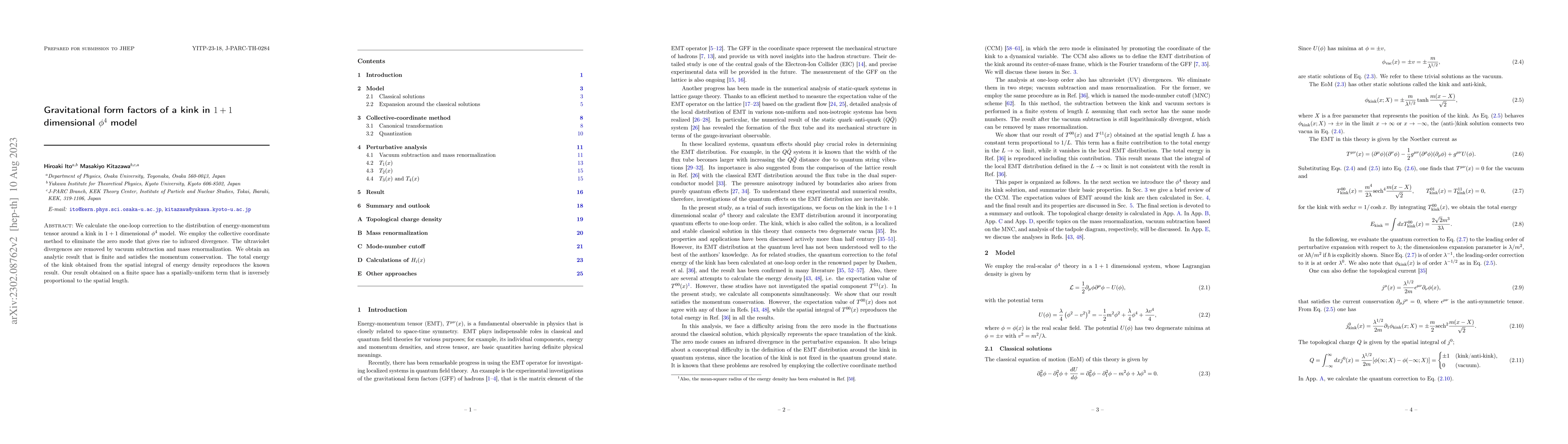 This paper calculates the one-loop correction to the energy-momentum tensor for a kink in a $1+1$ dimensional $\phi^4$ model, using the collective coordinate method to handle infrared divergences. The result is finite and satisfies momentum conservation, with a spatially-uniform term inversely proportional to the length of the finite space.