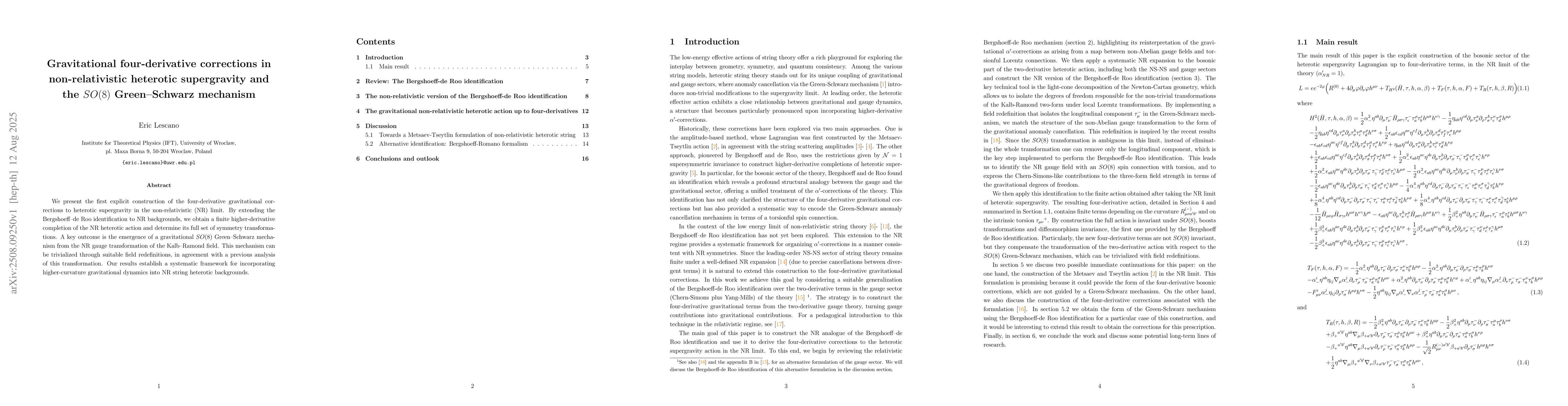 We present the first explicit construction of the four-derivative gravitational corrections to heterotic supergravity in the non-relativistic (NR) limit. By extending the Bergshoeff-de Roo identification to NR backgrounds, we obtain a finite higher-derivative completion of the NR heterotic action and determine its full set of symmetry transformations. A key outcome is the emergence of a gravitational $SO(8)$ Green-Schwarz mechanism from the NR gauge transformation of the Kalb-Ramond field. This mechanism can be trivialized through suitable field redefinitions, in agreement with a previous analysis of this transformation. Our results establish a systematic framework for incorporating higher-curvature gravitational dynamics into NR string heterotic backgrounds.