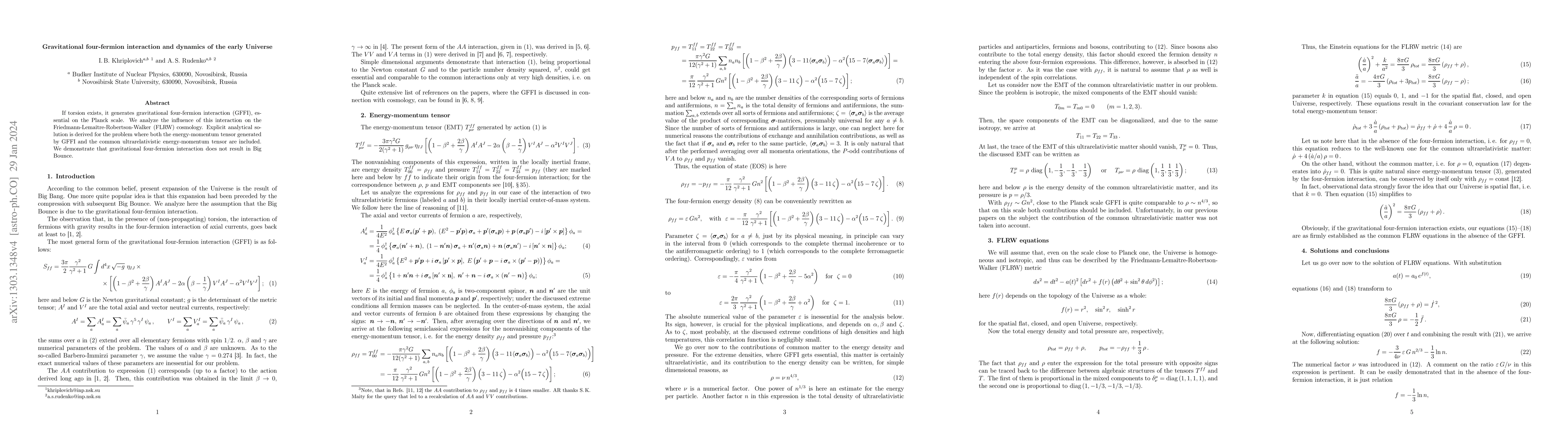 This paper investigates the gravitational four-fermion interaction (GFFI) generated by torsion and its implications for early Universe dynamics within the FLRW cosmology. An explicit analytical solution reveals that GFFI does not lead to a Big Bounce scenario.