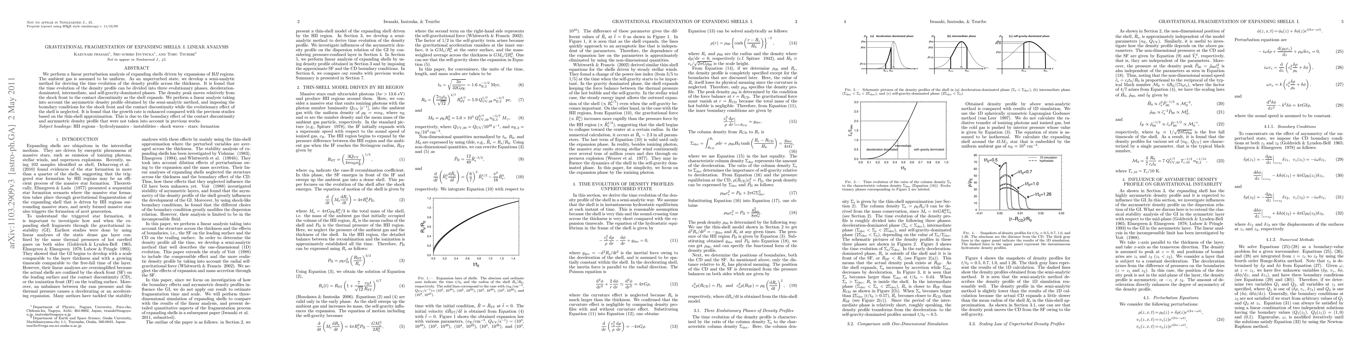 This paper conducts a linear perturbation analysis of expanding shells in HII regions, revealing three evolutionary phases in the density profile's time evolution. The study finds enhanced growth rates due to boundary effects at the contact discontinuity and an asymmetric density profile, differing from previous thin-shell approximation studies.