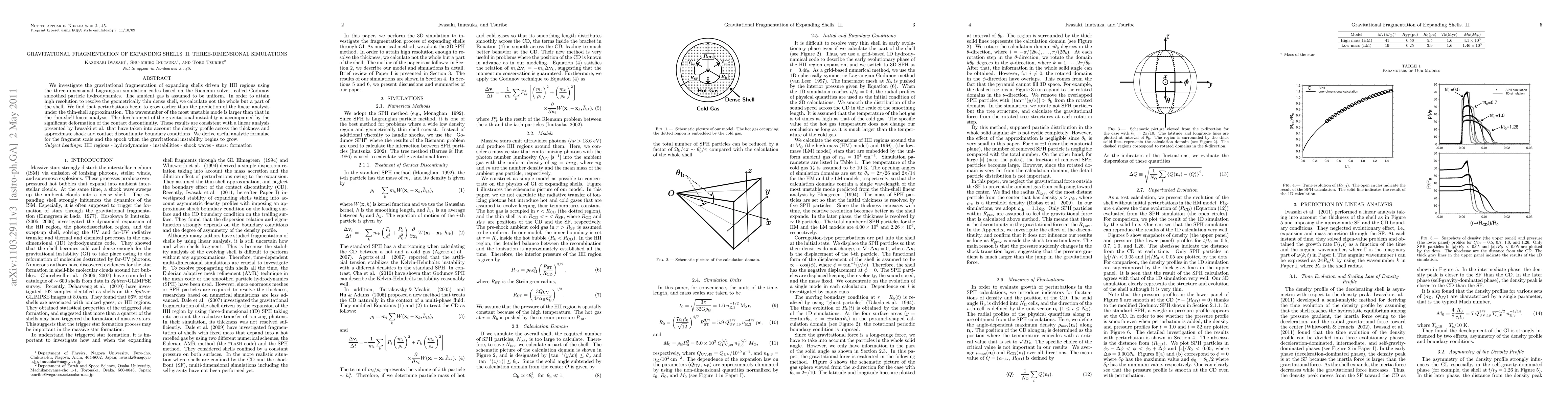 This paper uses three-dimensional Lagrangian simulations to study the gravitational fragmentation of expanding shells driven by HII regions, finding that perturbations grow earlier than predicted by linear analysis and that the wavenumber of the most unstable mode is larger. The results align with a prior linear analysis considering the density profile and boundary conditions.