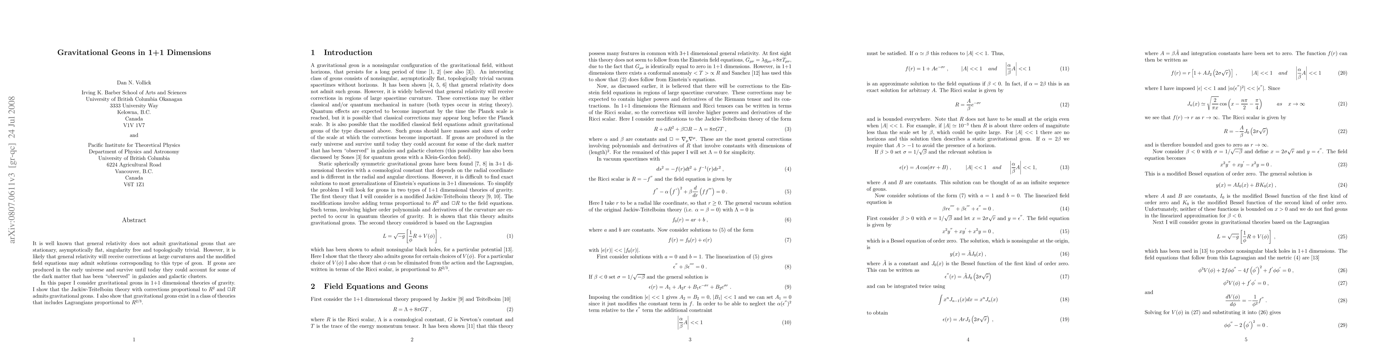This paper explores the existence of gravitational geons in 1+1 dimensional gravity theories, demonstrating that certain modified field equations, such as those in Jackiw-Teitelboim theory with $R^2$ and $\Box R$ corrections, can support geon solutions. It suggests that these geons could potentially constitute a fraction of the dark matter observed in galaxies and galactic clusters if they were formed in the early universe.
