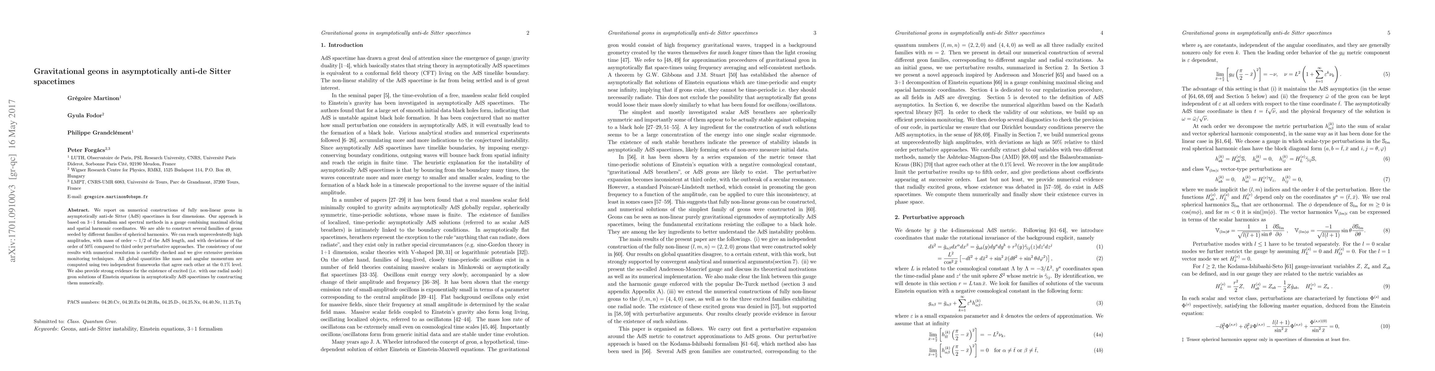 This paper reports on the numerical construction of fully non-linear geons in four-dimensional asymptotically anti-de Sitter spacetimes using 3+1 formalism and spectral methods. The authors demonstrate the existence of geons with high amplitudes and provide evidence for excited geon solutions, achieving precision at the $0.1\%$ level.