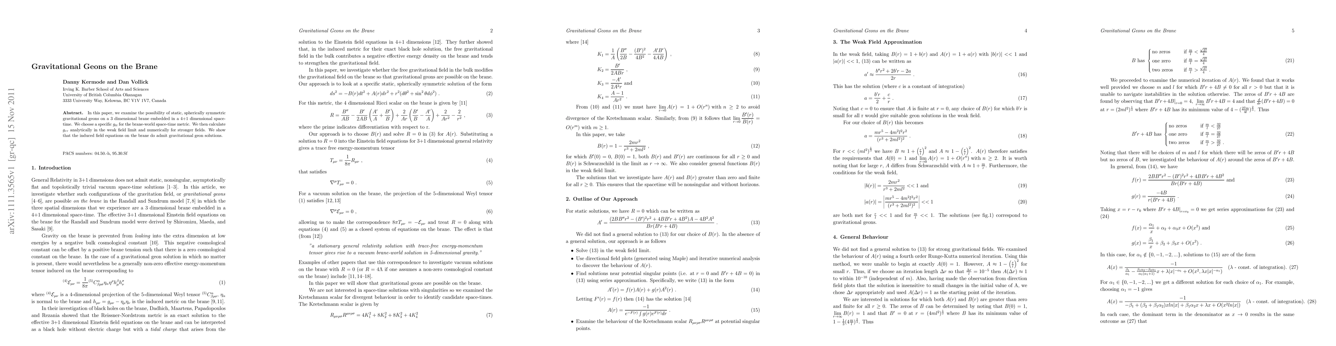 In this paper, we examine the possibility of static, spherically symmetric gravitational geons on a 3 dimensional brane embedded in a 4+1 dimensional space-time. We choose a specific g_tt for the brane-world space-time metric. We then calculate g_rr analytically in the weak field limit and numerically for stronger fields. We show that the induced field equations on the brane do admit gravitational geon solutions.