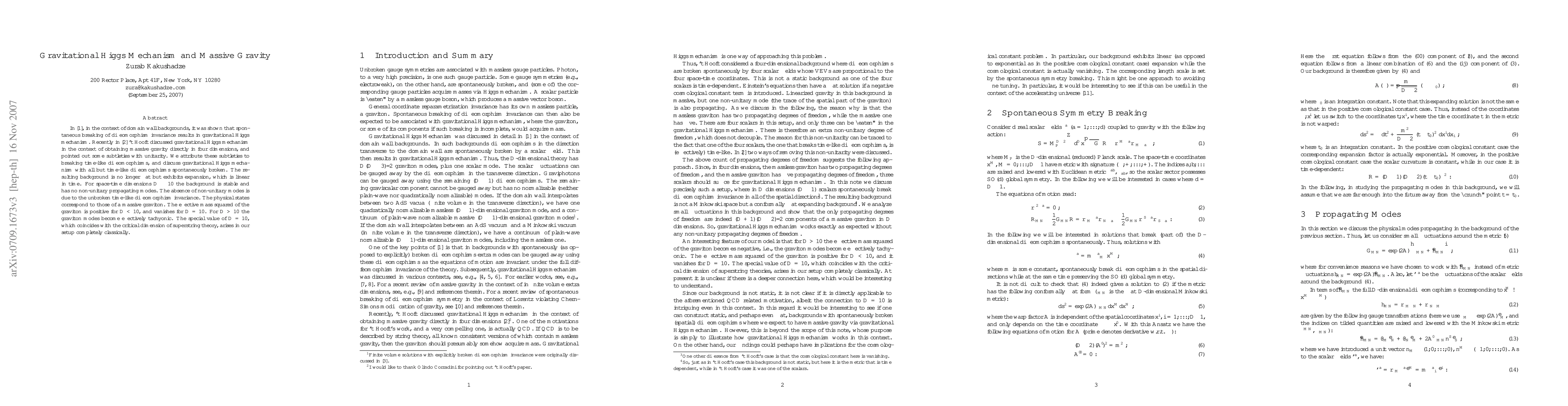This paper explores the gravitational Higgs mechanism in the context of massive gravity, demonstrating that spontaneous breaking of diffeomorphism invariance leads to a massive graviton without non-unitary modes for spacetime dimensions D ≤ 10. The critical dimension D=10 emerges naturally, coinciding with the dimension of superstring theory.