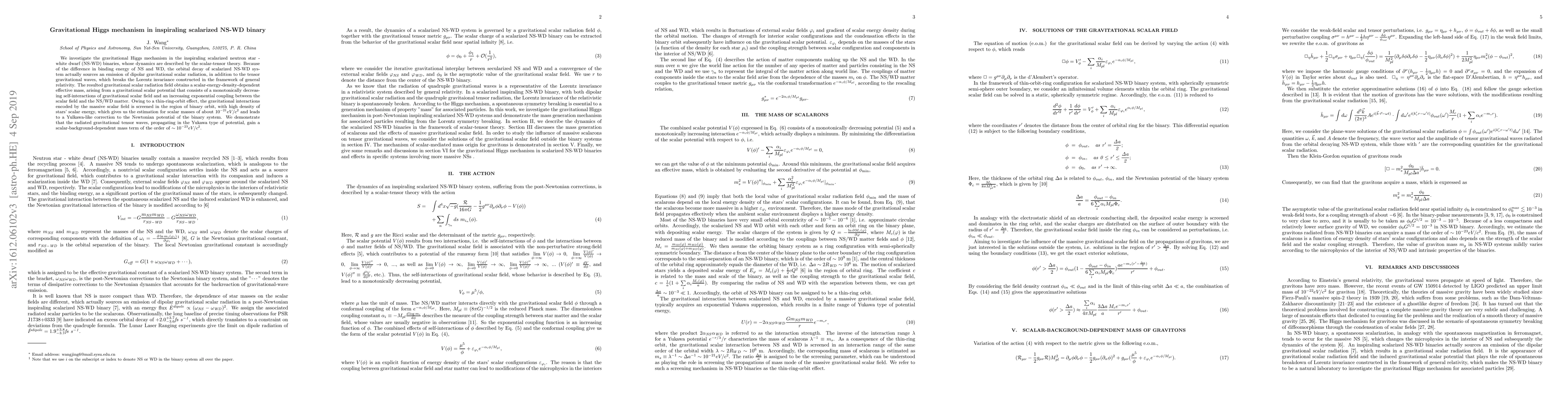We investigate the gravitational Higgs mechanism in the inspiraling scalarized neutron star - white dwarf (NS-WD) binaries, whose dynamics are described by the scalar-tensor theory. Because of the difference in binding energy of NS and WD, the orbital decay of scalarized NS-WD system actually sources an emission of dipolar gravitational scalar radiation, in addition to the tensor gravitational waves, which breaks the Lorentz invariance constructed in the framework of general relativity. The resulted gravitational scalar radiation field obtains a scalar-energy-density-dependent effective mass, arising from a gravitational scalar potential that consists of a monotonically decreasing self-interactions of gravitational scalar field and an increasing exponential coupling between the scalar field and the NS/WD matter. Owing to a thin-ring-orbit effect, the gravitational interactions encoded by the massive scalar field is screened in the region of binary orbit, with high density of stars' scalar energy, which gives us the estimation for scalar masses of about $10^{-21} eV/c^2$ and leads to a Yulkawa-like correction to the Newtonian potential of the binary system. We demonstrate that the radiated gravitational tensor waves, propagating in the Yukawa type of potential, gain a scalar-background-dependent mass term of the order of $\sim 10^{-23} eV/c^2$.