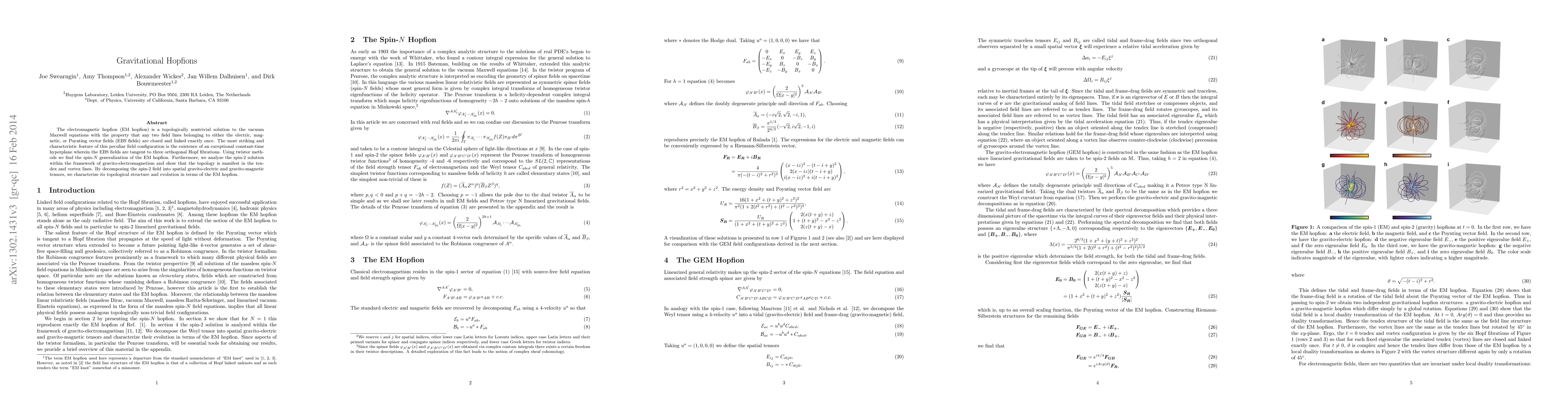 The electromagnetic hopfion (EM hopfion) is a topologically nontrivial solution to the vacuum Maxwell equations with the property that any two field lines belonging to either the electric, magnetic, or Poynting vector fields (EBS fields) are closed and linked exactly once. The most striking and characteristic feature of this peculiar field configuration is the existence of an exceptional constant-time hyperplane wherein the EBS fields are tangent to three orthogonal Hopf fibrations. Using twistor methods we find the spin-$N$ generalization of the EM hopfion. Furthermore, we analyze the spin-2 solution within the framework of gravito-electromagnetism and show that the topology is manifest in the tendex and vortex lines. By decomposing the spin-2 field into spatial gravito-electric and gravito-magnetic tensors, we characterize its topological structure and evolution in terms of the EM hopfion.