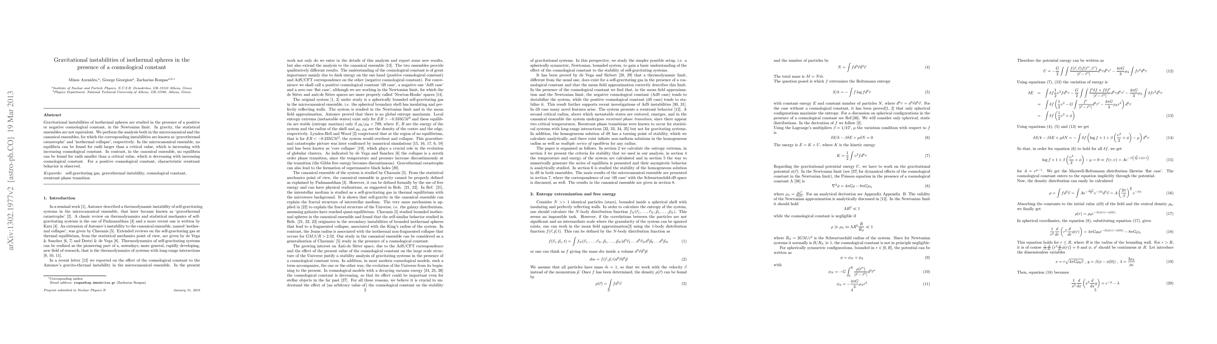 This paper investigates gravitational instabilities in isothermal spheres under the influence of a cosmological constant, analyzing both microcanonical and canonical ensembles. In the microcanonical ensemble, no equilibria exist for large radii, while in the canonical ensemble, no equilibria exist for small radii, with critical values influenced by the cosmological constant.