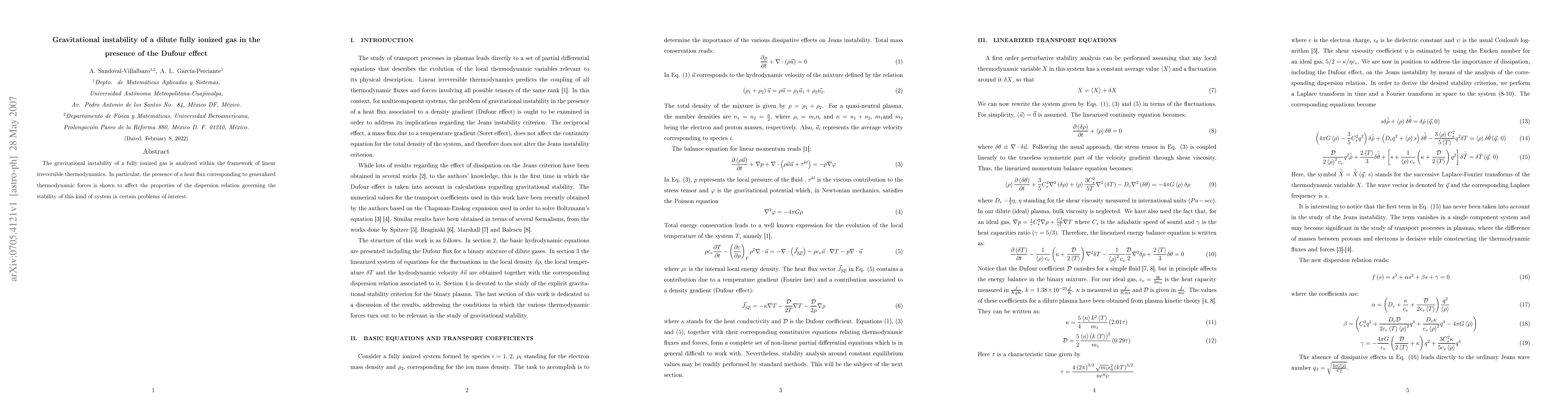 The gravitational instability of a fully ionized gas is analyzed within the framework of linear irreversible thermodynamics. In particular, the presence of a heat flux corresponding to generalized thermodynamic forces is shown to affect the properties of the dispersion relation governing the stability of this kind of system in certain problems of interest.