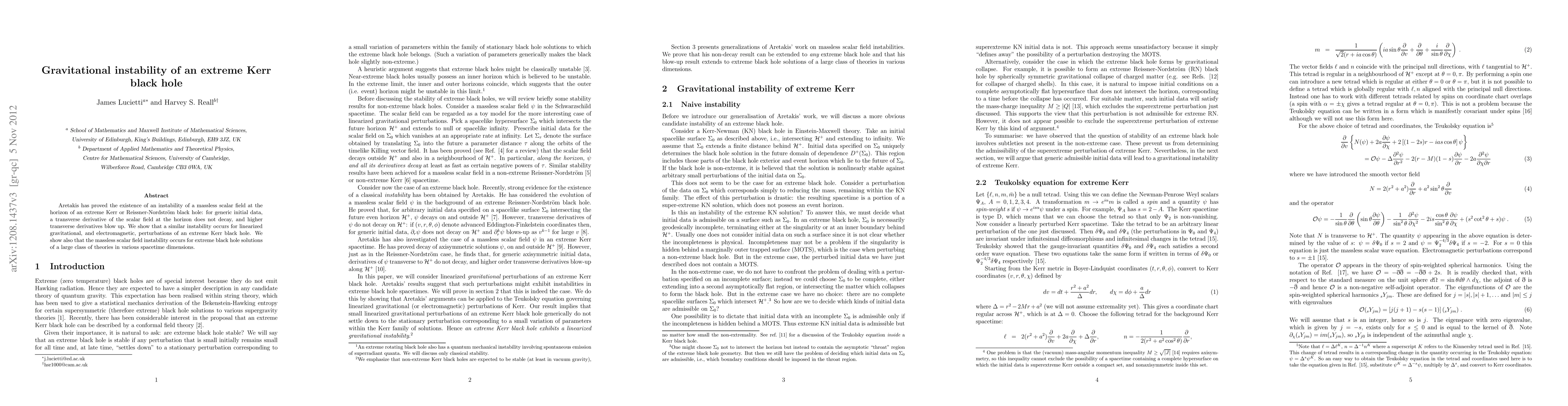 This paper demonstrates the existence of gravitational and electromagnetic instabilities in extreme Kerr black holes, extending Aretakis's proof of scalar field instability to broader perturbations and various spacetime dimensions. The findings reveal that higher derivatives of perturbations do not decay and instead blow up, indicating a fundamental instability in the extreme black hole horizon.