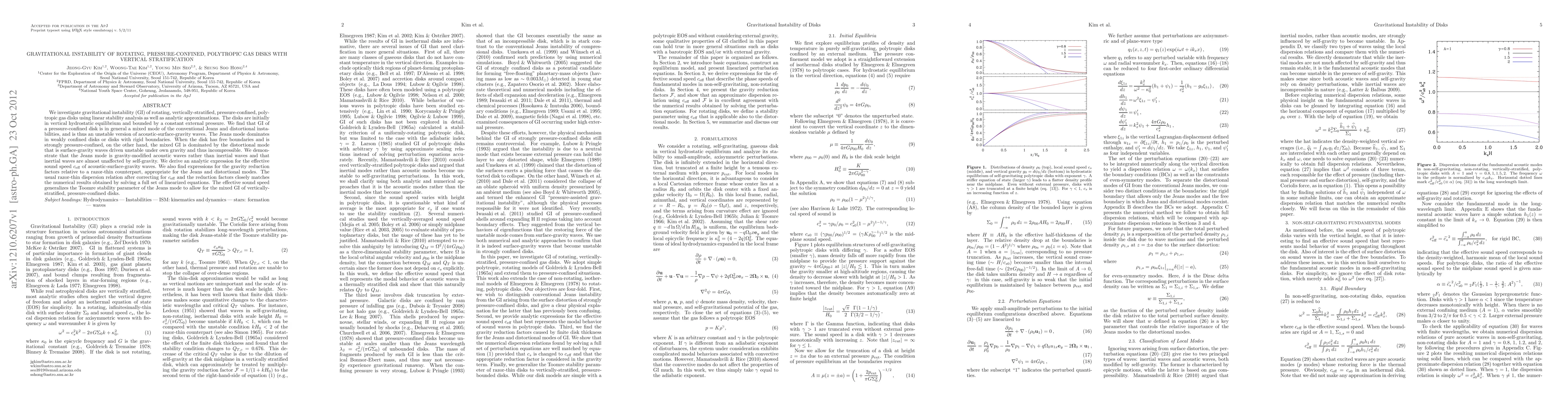 We investigate gravitational instability (GI) of rotating, vertically-stratified, pressure-confined, polytropic gas disks using linear stability analysis as well as analytic approximations. The disks are initially in vertical hydrostatic equilibrium and bounded by a constant external pressure. We find that GI of a pressure-confined disk is in general a mixed mode of the conventional Jeans and distortional instabilities, and is thus an unstable version of acoustic-surface-gravity waves. The Jeans mode dominates in weakly confined disks or disks with rigid boundaries. When the disk has free boundaries and is strongly pressure-confined, on the other hand, the mixed GI is dominated by the distortional mode that is surface-gravity waves driven unstable under own gravity and thus incompressible. We demonstrate that the Jeans mode is gravity-modified acoustic waves rather than inertial waves and that inertial waves are almost unaffected by self-gravity. We derive an analytic expression for the effective sound speed c_eff of acoustic-surface-gravity waves. We also find expressions for the gravity reduction factors relative to a razor-thin counterpart, appropriate for the Jeans and distortional modes. The usual razor-thin dispersion relation after correcting for c_eff and the reduction factors closely matches the numerical results obtained by solving a full set of linearized equations. The effective sound speed generalizes the Toomre stability parameter of the Jeans mode to allow for the mixed GI of vertically-stratified, pressure-confined disks.
