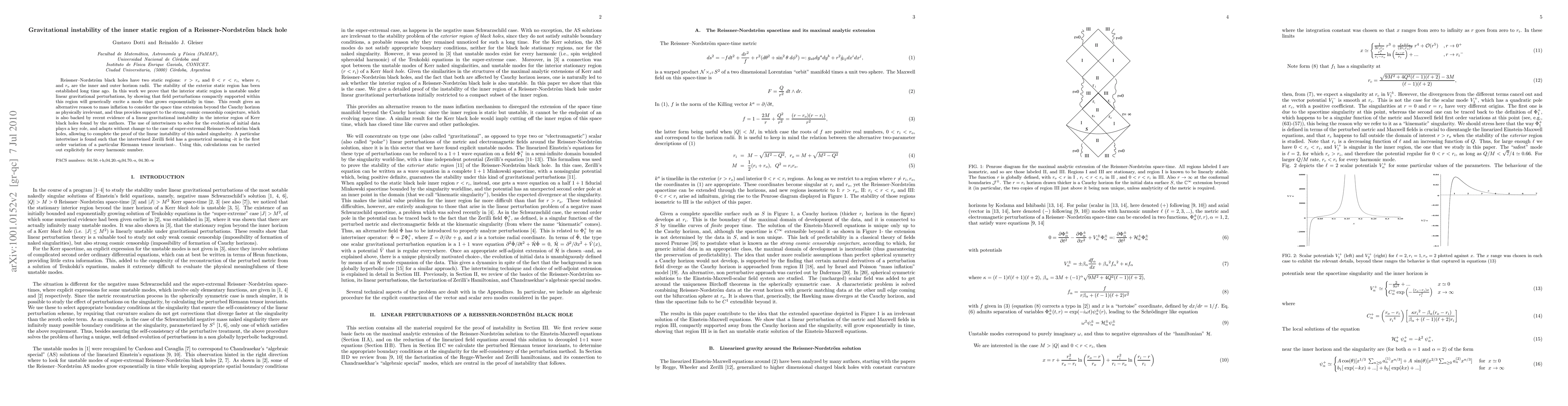 Reissner--Nordstr\"om black holes have two static regions: $r > \ro$ and $0 < r < \ri$, where $\ri$ and $\ro$ are the inner and outer horizon radii. The stability of the exterior static region has been established long time ago. In this work we prove that the interior static region is unstable under linear gravitational perturbations, by showing that field perturbations compactly supported within this region will generically excite a mode that grows exponentially in time. This result gives an alternative reason to mass inflation to consider the space time extension beyond the Cauchy horizon as physically irrelevant, and thus provides support to the strong cosmic censorship conjecture, which is also backed by recent evidence of a linear gravitational instability in the interior region of Kerr black holes found by the authors. The use of intertwiners to solve for the evolution of initial data plays a key role, and adapts without change to the case of super-extremal \rn black holes, allowing to complete the proof of the linear instability of this naked singularity. A particular intertwiner is found such that the intertwined Zerilli field has a geometrical meaning -it is the first order variation of a particular Riemann tensor invariant-. Using this, calculations can be carried out explicitely for every harmonic number.