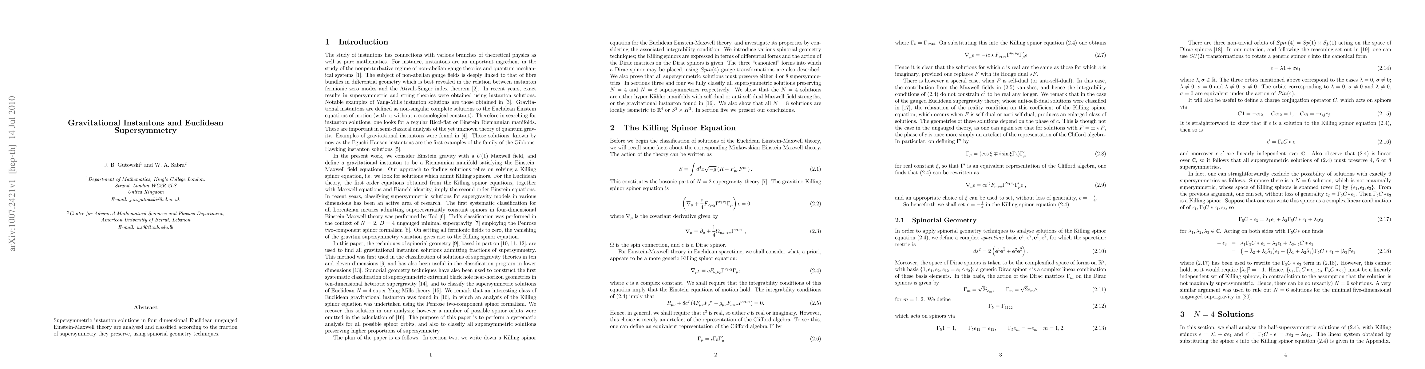 Supersymmetric instanton solutions in four dimensional Euclidean ungauged Einstein-Maxwell theory are analysed and classified according to the fraction of supersymmetry they preserve, using spinorial geometry techniques.