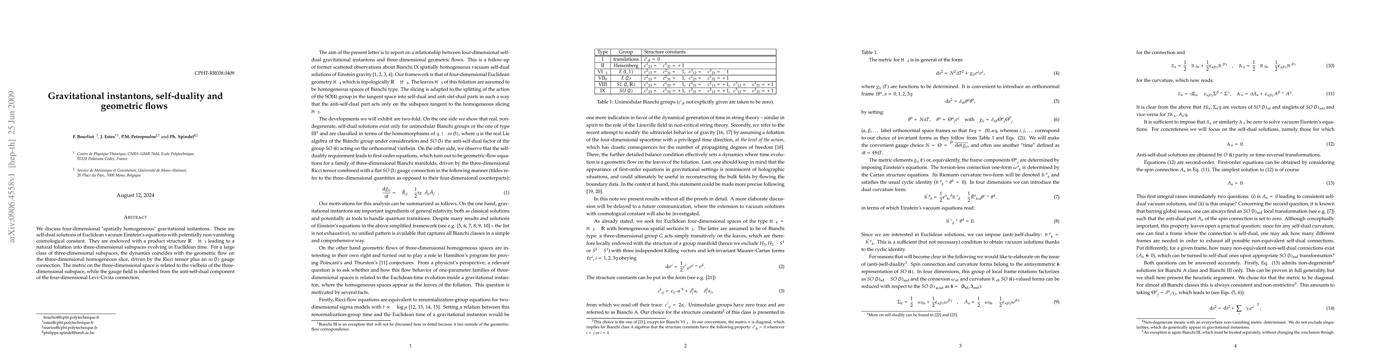 We discuss four-dimensional "spatially homogeneous" gravitational instantons. These are self-dual solutions of Euclidean vacuum Einstein's equations with potentially non-vanishing cosmological constant. They are endowed with a product structure R \times M_3 leading to a natural foliation into three-dimensional subspaces evolving in Euclidean time. For a large class of three-dimensional subspaces, the dynamics coincides with the geometric flow on the three-dimensional homogeneous slice, driven by the Ricci tensor plus an so(3) gauge connection. The metric on the three-dimensional space is related to the vielbein of the three-dimensional subspace, while the gauge field is inherited from the anti-self-dual component of the four-dimensional Levi--Civita connection.