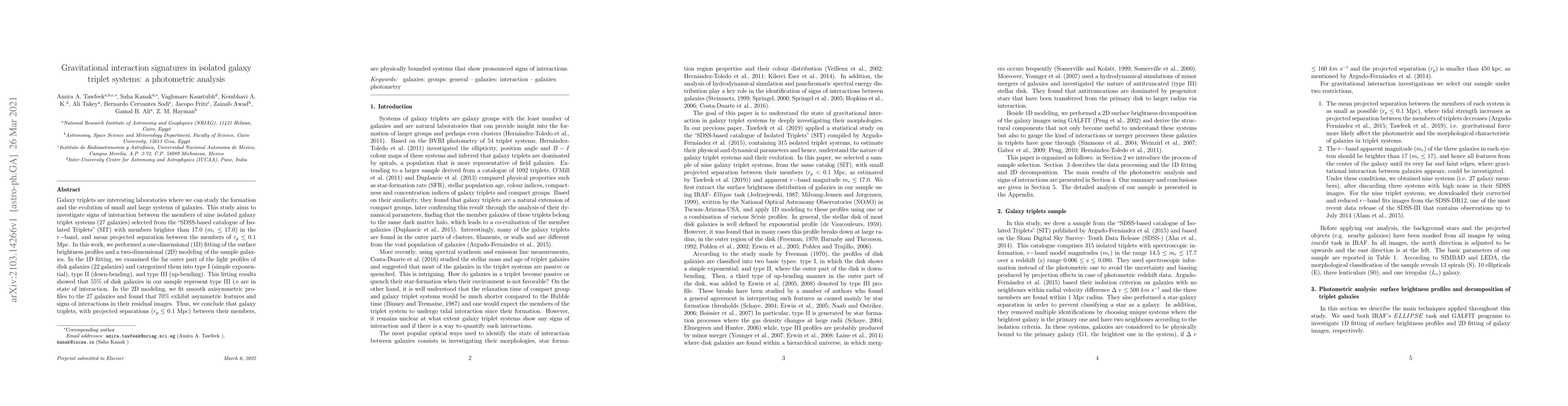 The research presents a detailed photometric analysis using 1D and 2D decomposition techniques to identify interaction signatures in galaxy triplets.