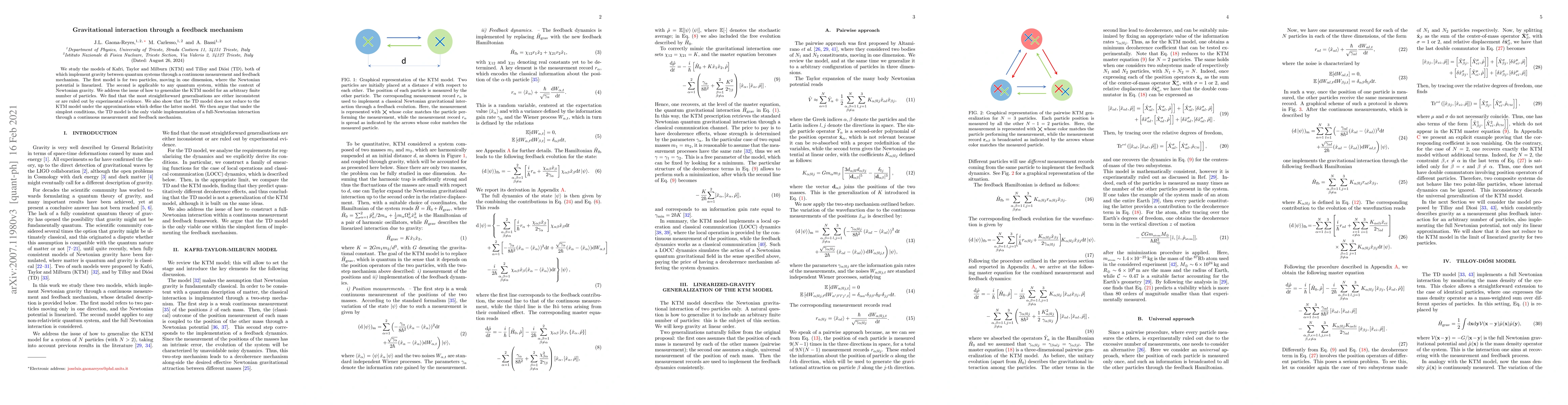 We study the models of Kafri, Taylor and Milburn (KTM) and Tilloy and Di\'osi (TD), both of which implement gravity between quantum systems through a continuous measurement and feedback mechanism. The first model is for two particles, moving in one dimension, where the Newtonian potential is linearized. The second is applicable to any quantum system, within the context of Newtonian gravity. We address the issue of how to generalize the KTM model for an arbitrary finite number of particles. We find that the most straightforward generalisations are either inconsistent or are ruled out by experimental evidence. We also show that the TD model does not reduce to the KTM model under the approximations which define the latter model. We then argue that under the simplest conditions, the TD model is the only viable implementation of a full-Newtonian interaction through a continuous measurement and feedback mechanism.