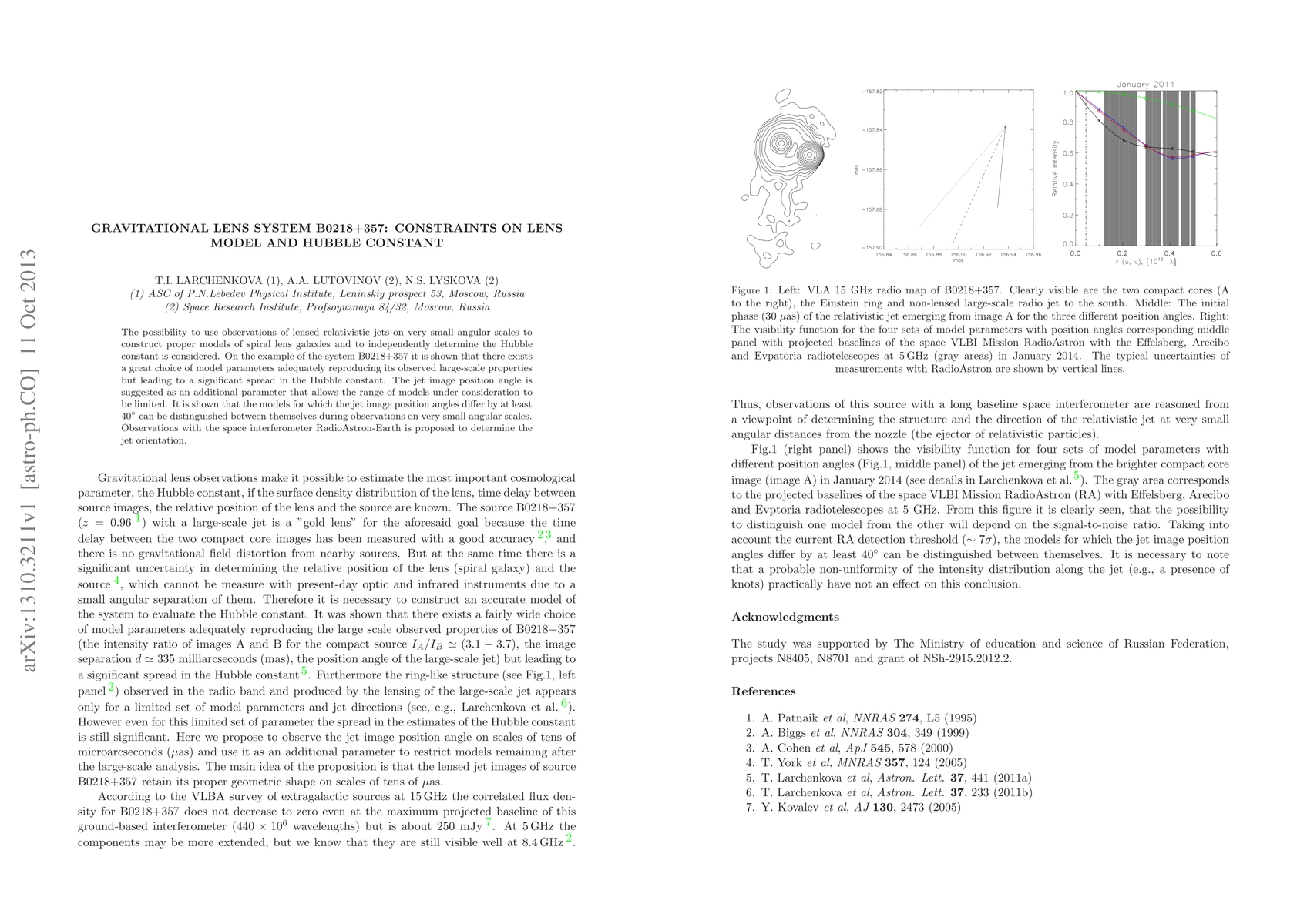 Researchers investigated the B0218+357 gravitational lens system to determine the Hubble constant and test a new lens model, finding that adding a jet image position angle parameter helps distinguish between models, enabling potential independent Hubble constant measurements.