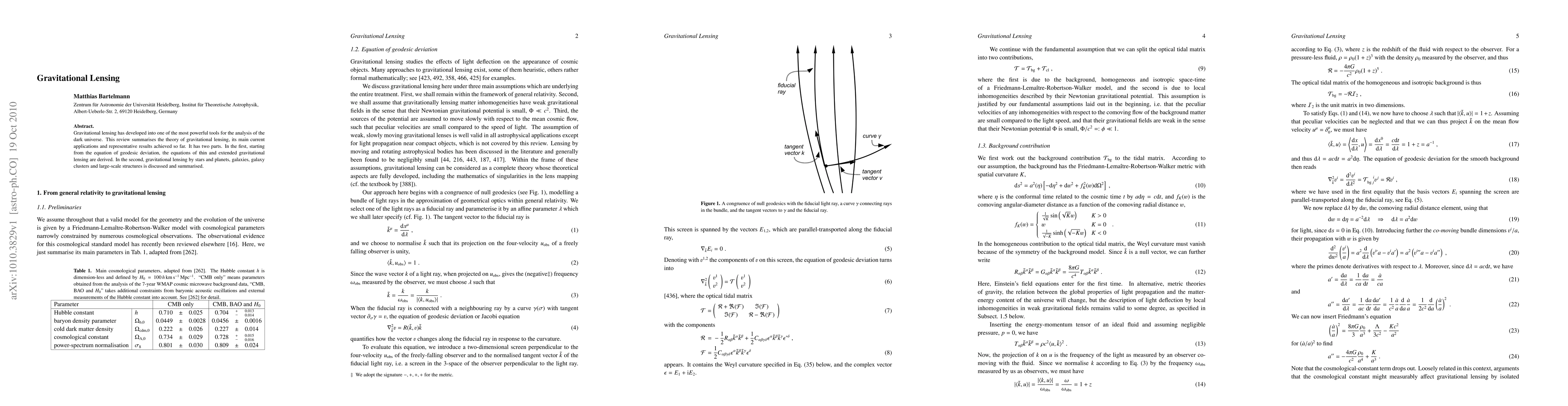 This paper reviews gravitational lensing theory and its applications, deriving equations from geodesic deviation and discussing its use in analyzing stars, planets, galaxies, galaxy clusters, and large-scale structures to study the dark universe.