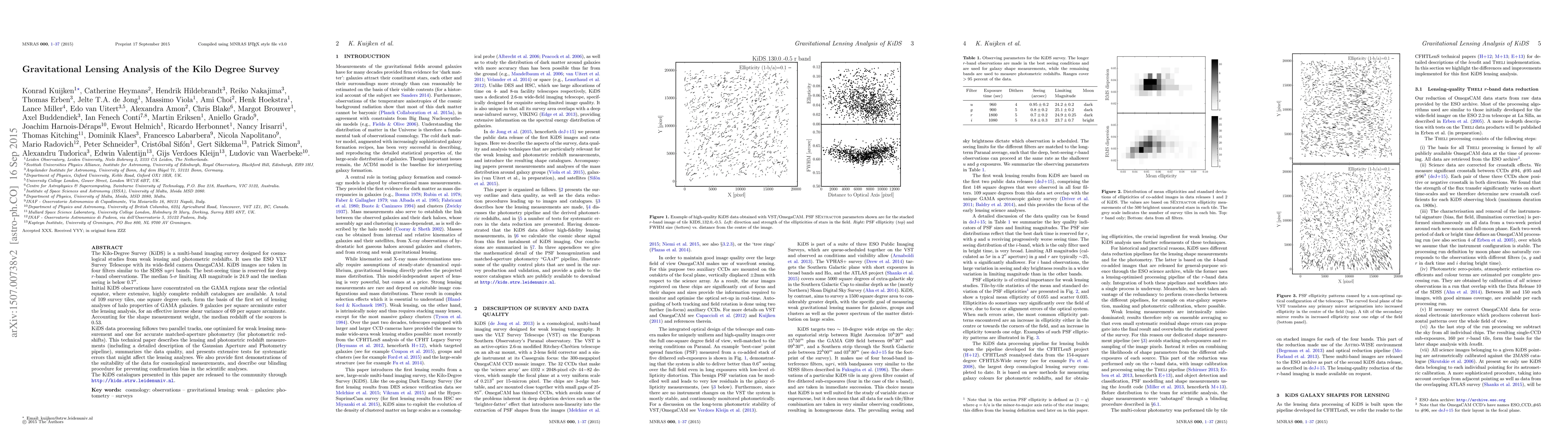 The Kilo-Degree Survey (KiDS) is a multi-band imaging survey designed for cosmological studies from weak lensing and photometric redshifts. It uses the ESO VLT Survey Telescope with its wide-field camera OmegaCAM. KiDS images are taken in four filters similar to the SDSS ugri bands. The best-seeing time is reserved for deep r-band observations that reach a median 5-sigma limiting AB magnitude of 24.9 with a median seeing that is better than 0.7arcsec. Initial KiDS observations have concentrated on the GAMA regions near the celestial equator, where extensive, highly complete redshift catalogues are available. A total of 109 survey tiles, one square degree each, form the basis of the first set of lensing analyses, which focus on measurements of halo properties of GAMA galaxies. 9 galaxies per square arcminute enter the lensing analysis, for an effective inverse shear variance of 69 per square arcminute. Accounting for the shape measurement weight, the median redshift of the sources is 0.53. KiDS data processing follows two parallel tracks, one optimized for galaxy shape measurement (for weak lensing), and one for accurate matched-aperture photometry in four bands (for photometric redshifts). This technical paper describes how the lensing and photometric redshift catalogues have been produced (including an extensive description of the Gaussian Aperture and Photometry pipeline), summarizes the data quality, and presents extensive tests for systematic errors that might affect the lensing analyses. We also provide first demonstrations of the suitability of the data for cosmological measurements, and explain how the shear catalogues were blinded to prevent confirmation bias in the scientific analyses. The KiDS shear and photometric redshift catalogues, presented in this paper, are released to the community through http://kids.strw.leidenuniv.nl .