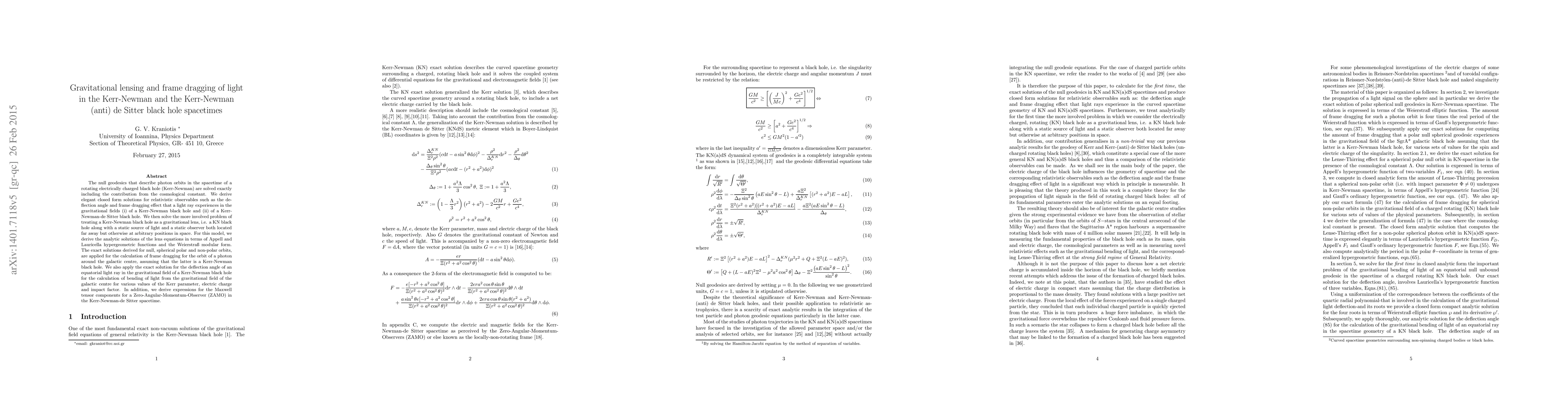This research paper presents exact solutions for null geodesics in the Kerr-Newman and Kerr-Newman-de Sitter black hole spacetimes, deriving closed-form expressions for deflection angles and frame dragging effects. It applies these solutions to gravitational lensing and light bending around rotating, charged black holes, including calculations for galactic centers.