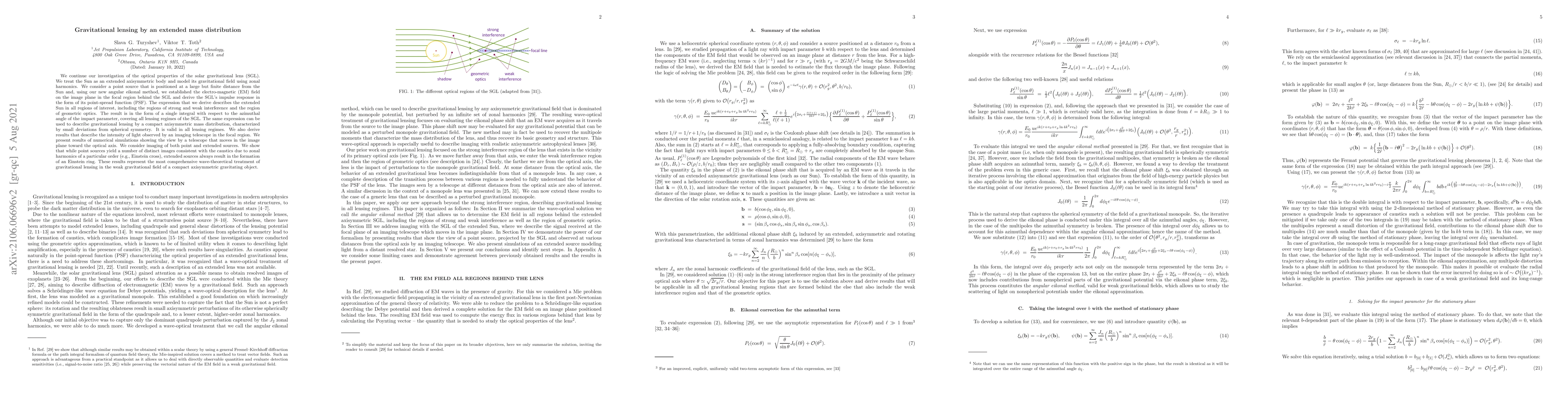 This paper investigates the optical properties of the solar gravitational lens (SGL) by modeling the Sun as an extended axisymmetric body, deriving its point-spread function (PSF) using a new angular eikonal method, and applying this to describe gravitational lensing in various regimes. The results show distinct imaging for point sources and Einstein rings for extended sources.