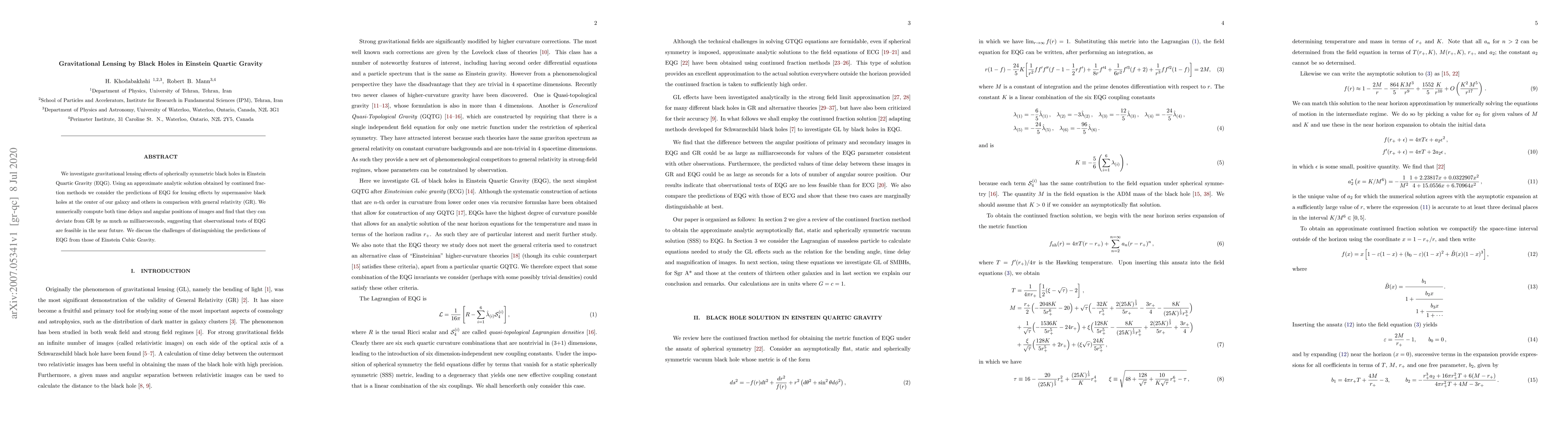 We investigate gravitational lensing effects of spherically symmetric black holes in Einstein Quartic Gravity (EQG). Using an approximate analytic solution obtained by continued fraction methods we consider the predictions of EQG for lensing effects by supermassive black holes at the center of our galaxy and others in comparison with general relativity (GR). We numerically compute both time delays and angular positions of images and find that they can deviate from GR by as much as milliarcseconds, suggesting that observational tests of EQG are feasible in the near future. We discuss the challenges of distinguishing the predictions of EQG from those of Einstein Cubic Gravity.