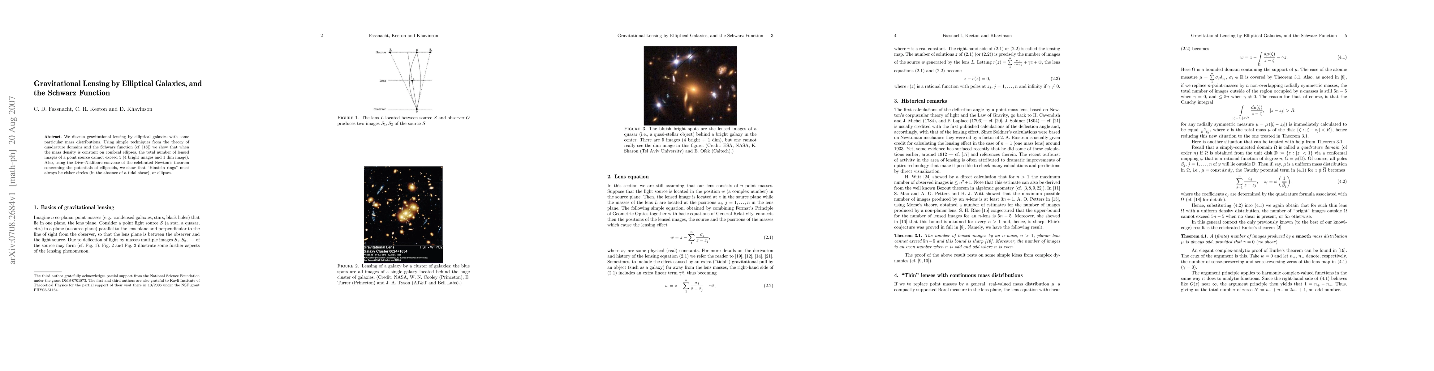 We discuss gravitational lensing by elliptical galaxies with some particular mass distributions. Using simple techniques from the theory of quadrature domains and the Schwarz function (cf. \cite{Sh}) we show that when the mass density is constant on confocal ellipses, the total number of lensed images of a point source cannot exceed 5 (4 bright images and 1 dim image). Also, using the Dive--Nikliborc converse of the celebrated Newton's theorem concerning the potentials of ellipsoids, we show that ``Einstein rings'' must always be either circles (in the absence of a tidal shear), or ellipses.