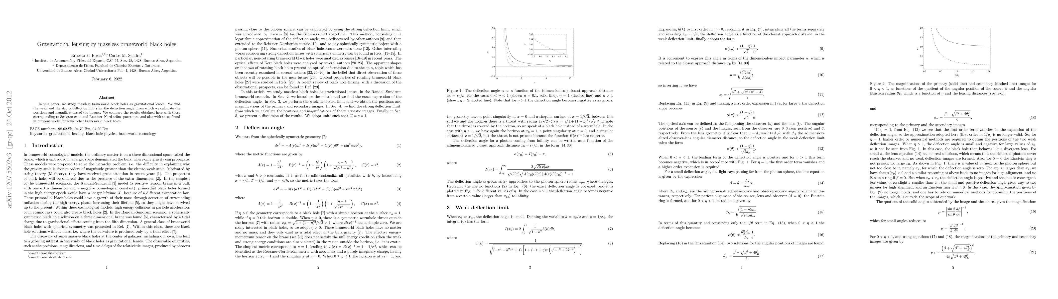 This paper investigates the gravitational lensing effects of massless braneworld black holes, determining both weak and strong deflection limits for the deflection angle and calculating image positions and magnifications. Comparisons are made with Schwarzschild, Reissner-Nordstrom, and other braneworld black hole models.