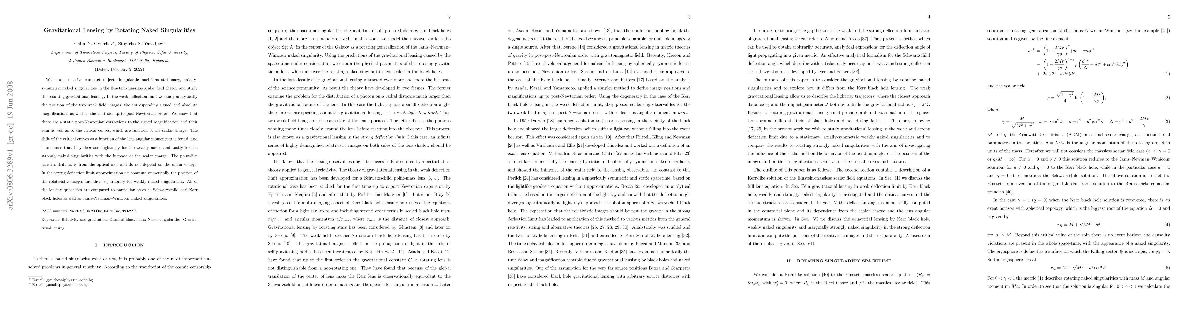 This paper models galactic nuclei as rotating naked singularities and investigates gravitational lensing effects, finding static post-Newtonian corrections to magnification and shifts in critical curves dependent on scalar charge. It also numerically analyzes relativistic images for weakly naked singularities, comparing results to Schwarzschild, Kerr, and Janis-Newman-Winicour cases.