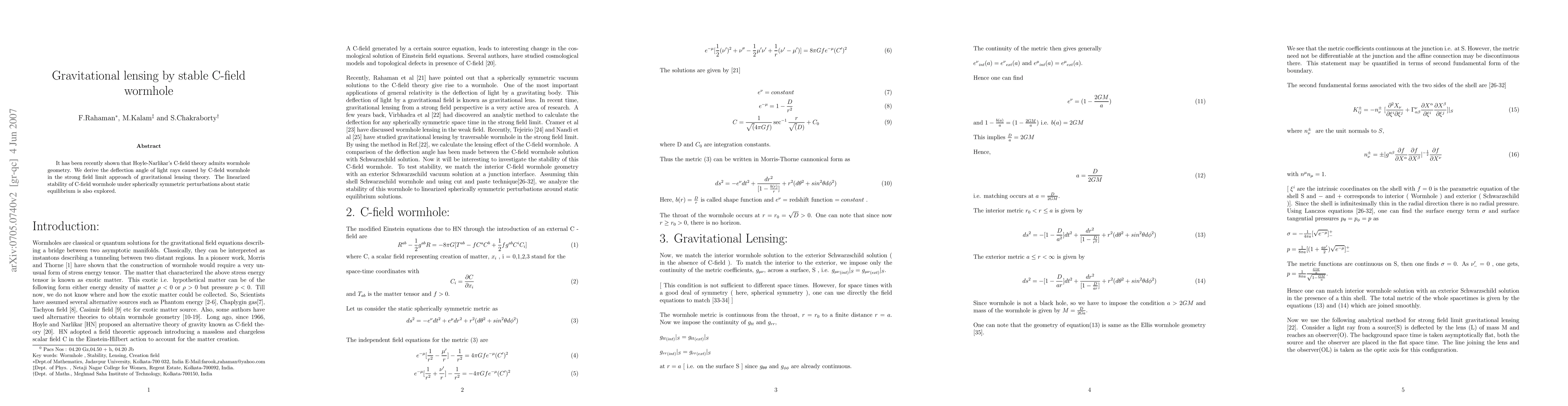 This paper explores gravitational lensing by a stable C-field wormhole derived from Hoyle-Narlikar's C-field theory, calculating the deflection angle of light rays in the strong field limit and investigating the wormhole's linearized stability under spherically symmetric perturbations.