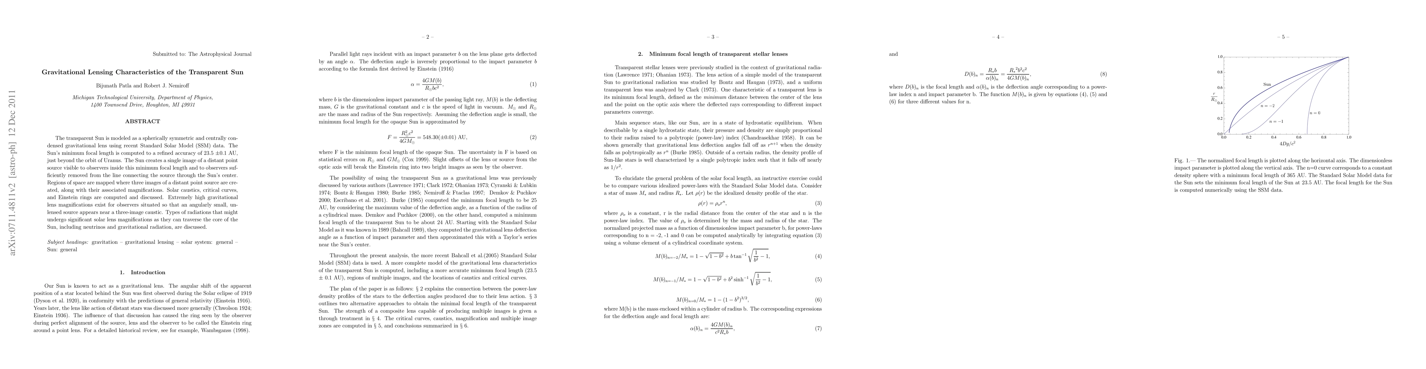 The transparent Sun is modeled as a spherically symmetric and centrally condensed gravitational lens using recent Standard Solar Model (SSM) data. The Sun's minimum focal length is computed to a refined accuracy of 23.5 +/- 0.1 AU, just beyond the orbit of Uranus. The Sun creates a single image of a distant point source visible to observers inside this minimum focal length and to observers sufficiently removed from the line connecting the source through the Sun's center. Regions of space are mapped where three images of a distant point source are created, along with their associated magnifications. Solar caustics, critical curves, and Einstein rings are computed and discussed. Extremely high gravitational lens magnifications exist for observers situated so that an angularly small, unlensed source appears near a three-image caustic. Types of radiations that might undergo significant solar lens magnifications as they can traverse the core of the Sun, including neutrinos and gravitational radiation, are discussed.