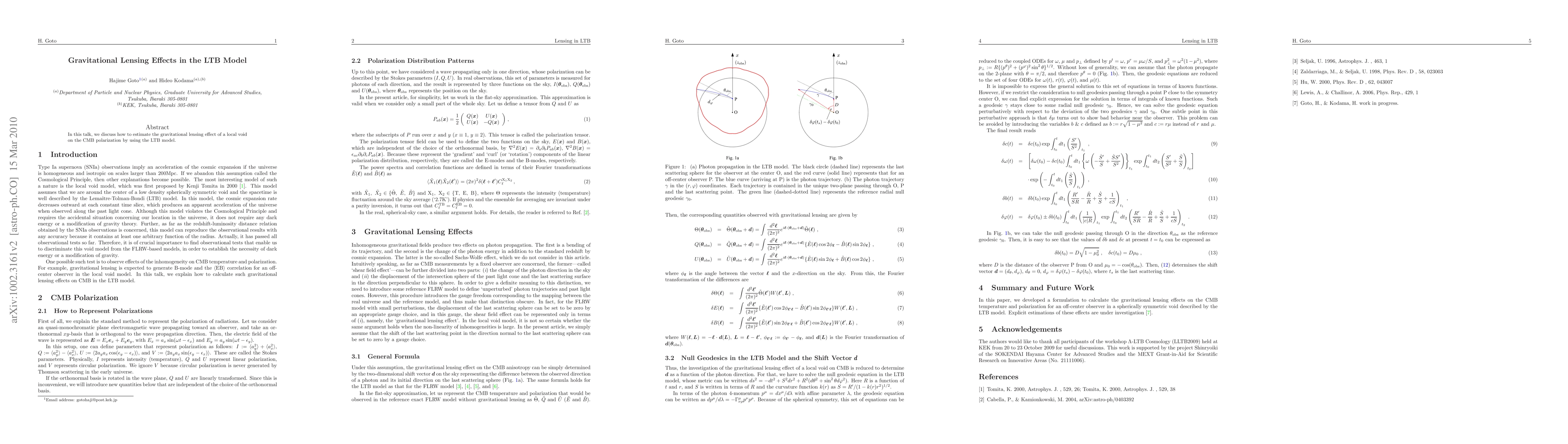 In this talk, we discuss how to estimate the gravitational lensing effect of a local void on the CMB polarization by using the LTB model.