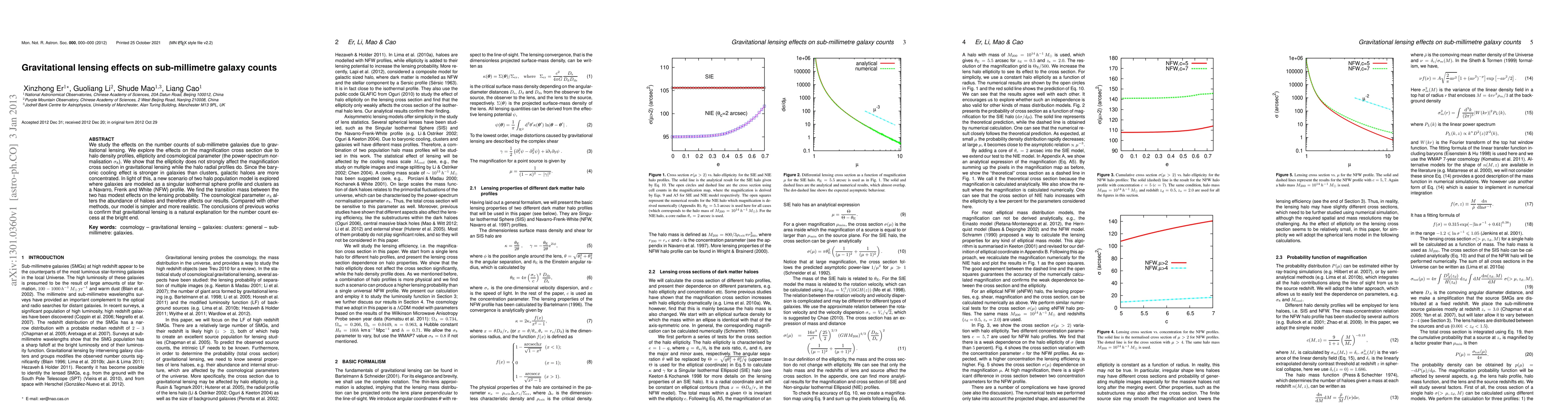 We study the effects on the number counts of sub-millimetre galaxies due to gravitational lensing. We explore the effects on the magnification cross section due to halo density profiles, ellipticity and cosmological parameter (the power-spectrum normalisation $\sigma_8$). We show that the ellipticity does not strongly affect the magnification cross section in gravitational lensing while the halo radial profiles do. Since the baryonic cooling effect is stronger in galaxies than clusters, galactic haloes are more concentrated. In light of this, a new scenario of two halo population model is explored where galaxies are modeled as a singular isothermal sphere profile and clusters as a Navarro, Frenk and White (NFW) profile. We find the transition mass between the two has modest effects on the lensing probability. The cosmological parameter $\sigma_8$ alters the abundance of haloes and therefore affects our results. Compared with other methods, our model is simpler and more realistic. The conclusions of previous works is confirm that gravitational lensing is a natural explanation for the number count excess at the bright end.