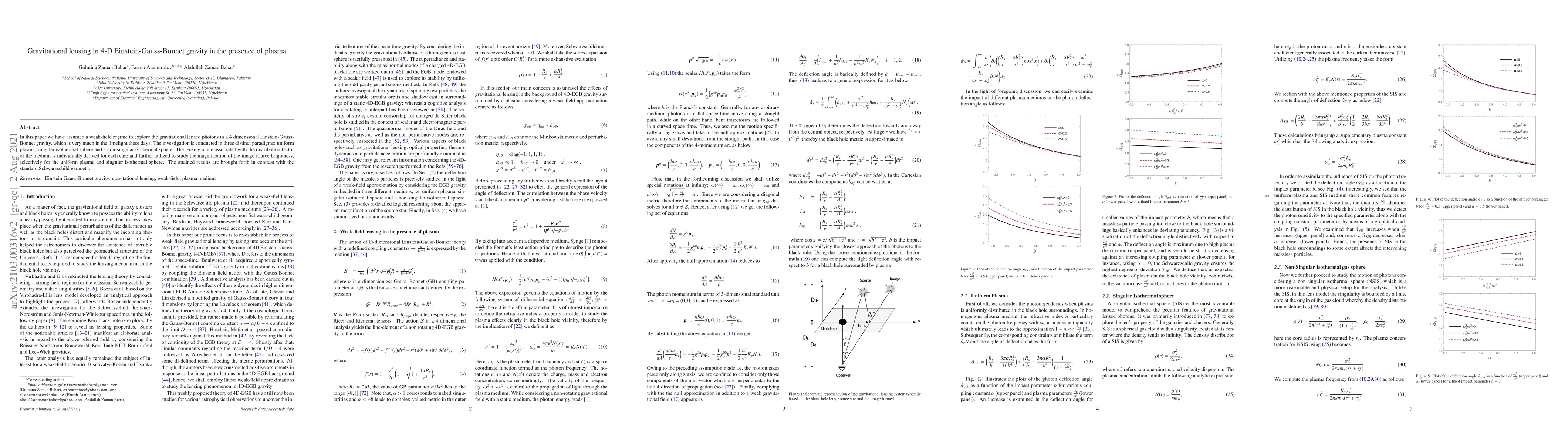 This paper investigates gravitational lensing in 4-D Einstein-Gauss-Bonnet gravity under a weak-field regime, focusing on plasma environments. It examines three paradigms: uniform plasma, singular isothermal sphere, and non-singular isothermal sphere, deriving lensing angles and comparing image brightness magnification against standard Schwarzschild geometry.