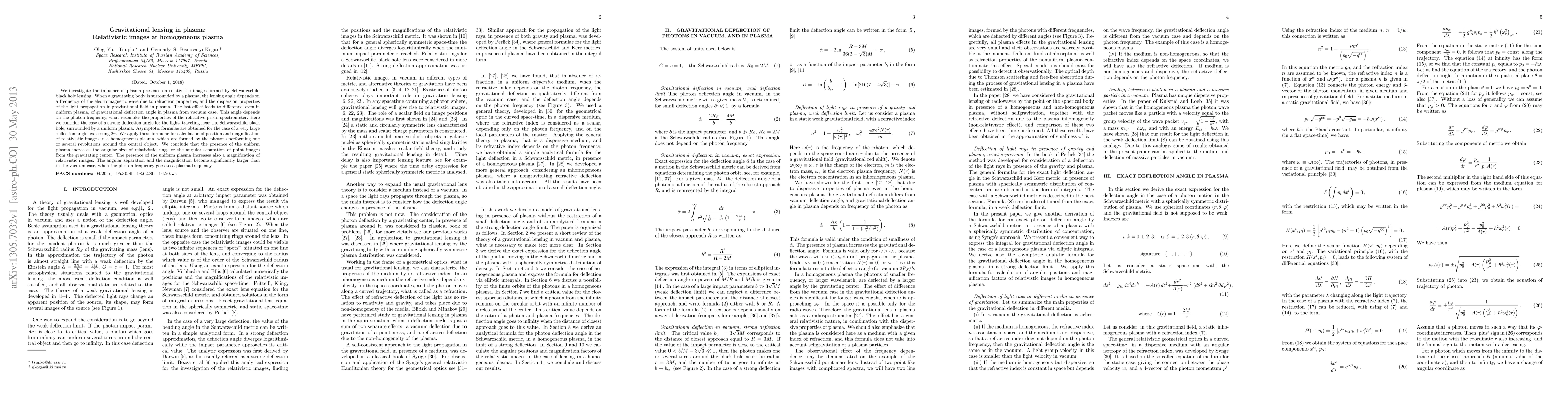 This paper examines how plasma surrounding a Schwarzschild black hole affects gravitational lensing, showing that plasma alters the deflection angle of light due to refraction and dispersion. The study finds that uniform plasma significantly increases the angular size and magnification of relativistic images compared to the vacuum case, especially as photon frequency approaches plasma frequency.