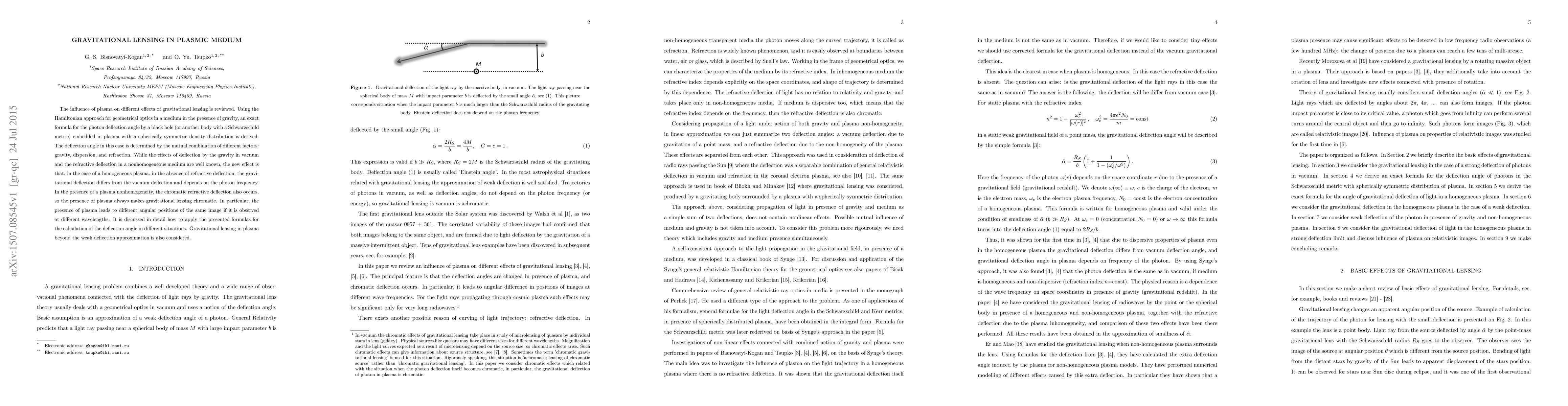 The influence of plasma on different effects of gravitational lensing is reviewed. Using the Hamiltonian approach for geometrical optics in a medium in the presence of gravity, an exact formula for the photon deflection angle by a black hole (or another body with a Schwarzschild metric) embedded in plasma with a spherically symmetric density distribution is derived. The deflection angle in this case is determined by the mutual combination of different factors: gravity, dispersion, and refraction. While the effects of deflection by the gravity in vacuum and the refractive deflection in a nonhomogeneous medium are well known, the new effect is that, in the case of a homogeneous plasma, in the absence of refractive deflection, the gravitational deflection differs from the vacuum deflection and depends on the photon frequency. In the presence of a plasma nonhomogeneity, the chromatic refractive deflection also occurs, so the presence of plasma always makes gravitational lensing chromatic. In particular, the presence of plasma leads to different angular positions of the same image if it is observed at different wavelengths. It is discussed in detail how to apply the presented formulas for the calculation of the deflection angle in different situations. Gravitational lensing in plasma beyond the weak deflection approximation is also considered.