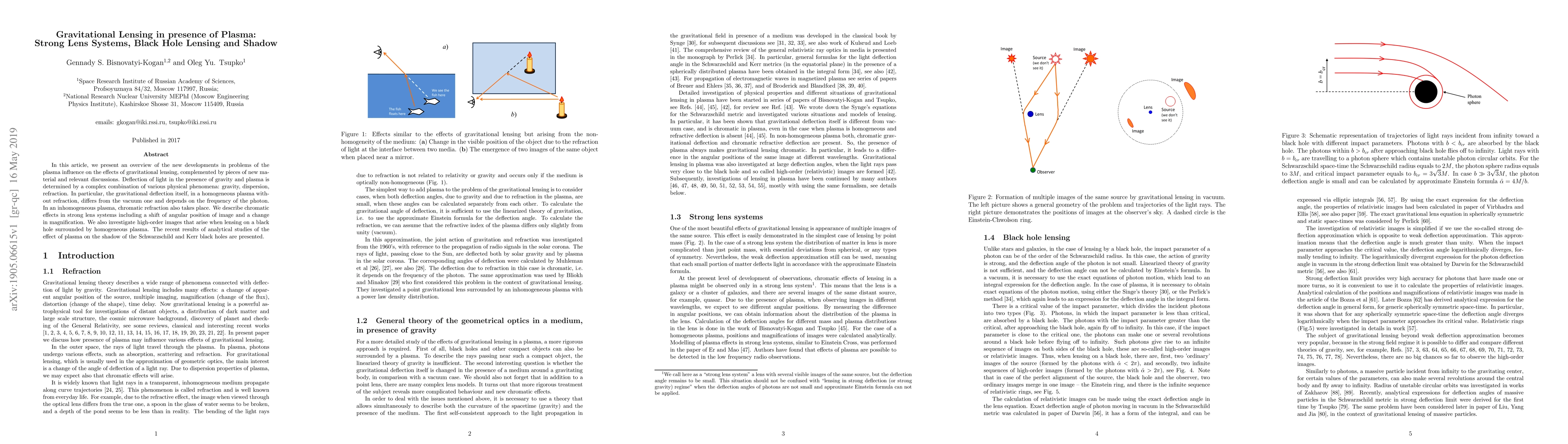 In this article, we present an overview of the new developments in problems of the plasma influence on the effects of gravitational lensing, complemented by pieces of new material and relevant discussions. Deflection of light in the presence of gravity and plasma is determined by a complex combination of various physical phenomena: gravity, dispersion, refraction. In particular, the gravitational deflection itself, in a homogeneous plasma without refraction, differs from the vacuum one and depends on the frequency of the photon. In an inhomogeneous plasma, chromatic refraction also takes place. We describe chromatic effects in strong lens systems including a shift of angular position of image and a change in magnification. We also investigate high-order images that arise when lensing on a black hole surrounded by homogeneous plasma. The recent results of analytical studies of the effect of plasma on the shadow of the Schwarzschild and Kerr black holes are presented.
