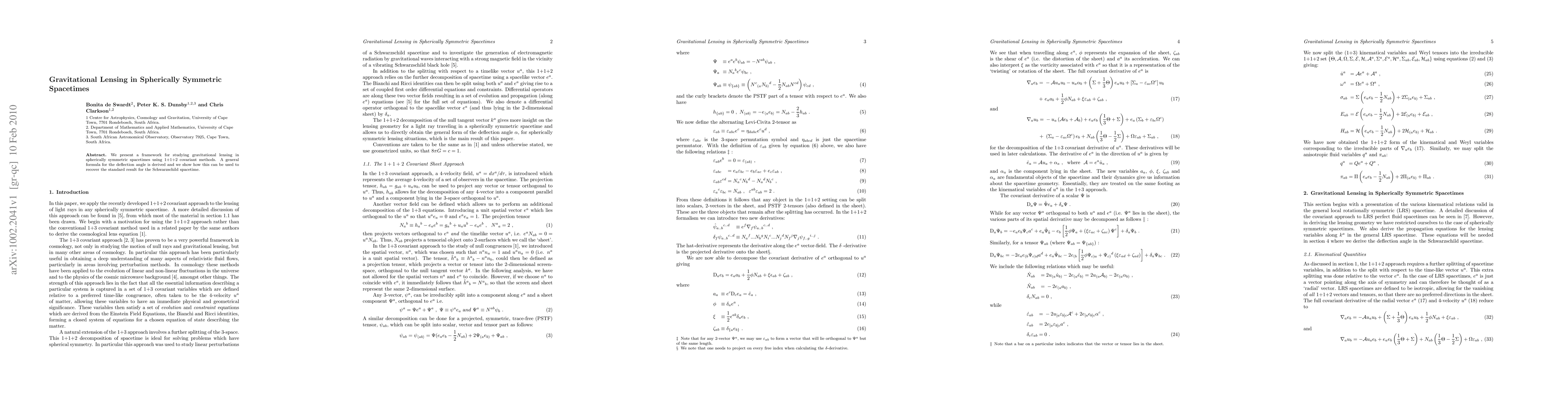 This paper develops a framework for gravitational lensing in spherically symmetric spacetimes using 1+1+2 covariant methods, deriving a general formula for the deflection angle and demonstrating its application to the Schwarzschild spacetime.