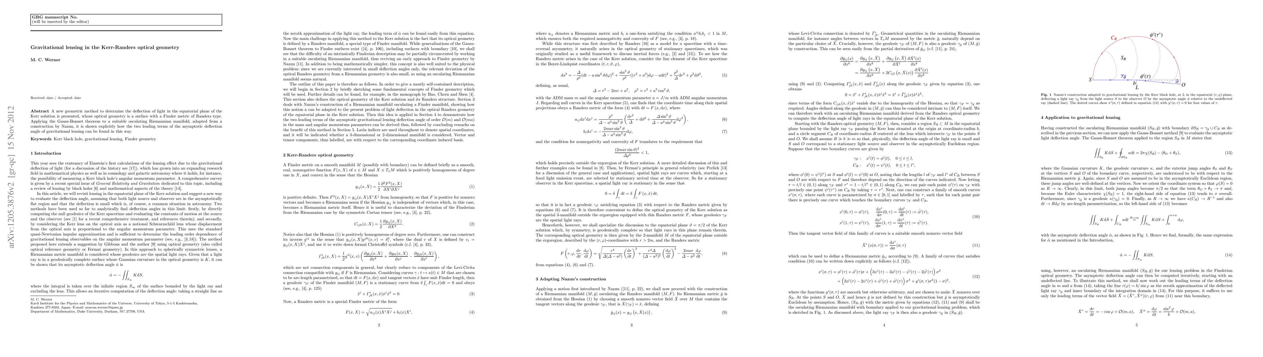 A new geometric method to determine the deflection of light in the equatorial plane of the Kerr solution is presented, whose optical geometry is a surface with a Finsler metric of Randers type. Applying the Gauss-Bonnet theorem to a suitable osculating Riemannian manifold, adapted from a construction by Naz\i m, it is shown explicitly how the two leading terms of the asymptotic deflection angle of gravitational lensing can be found in this way.