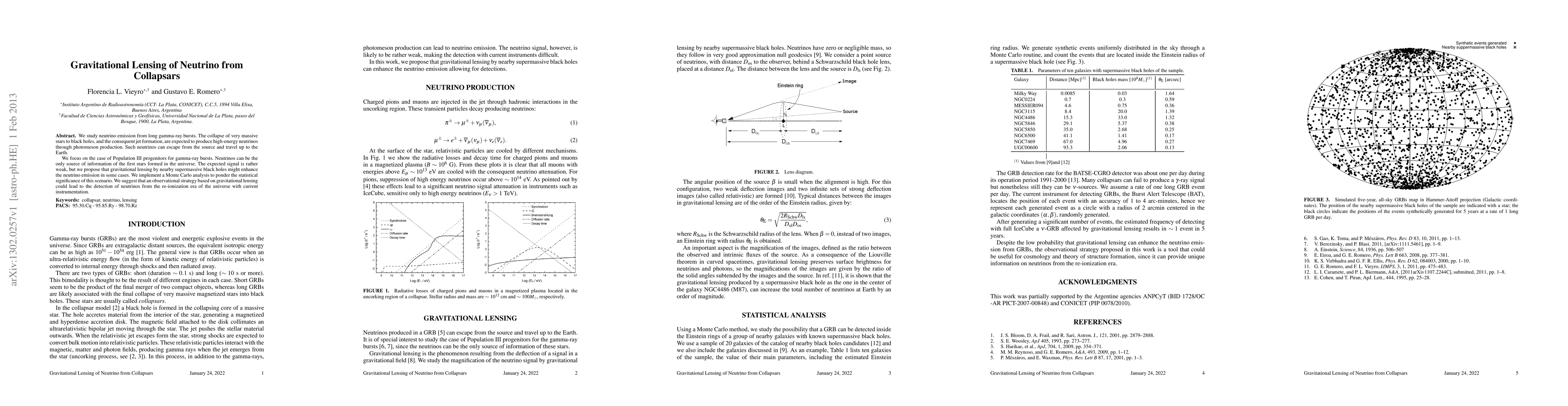 We study neutrino emission from long gamma-ray bursts. The collapse of very massive stars to black holes, and the consequent jet formation, are expected to produce high-energy neutrinos through photomeson production. Such neutrinos can escape from the source and travel up to the Earth. We focus on the case of Population III progenitors for gamma-ray bursts. Neutrinos can be the only source of information of the first stars formed in the universe. The expected signal is rather weak, but we propose that gravitational lensing by nearby supermassive black holes might enhance the neutrino emission in some cases. We implement a Monte Carlo analysis to ponder the statistical significance of this scenario. We suggest that an observational strategy based on gravitational lensing could lead to the detection of neutrinos from the re-ionization era of the universe with current instrumentation.