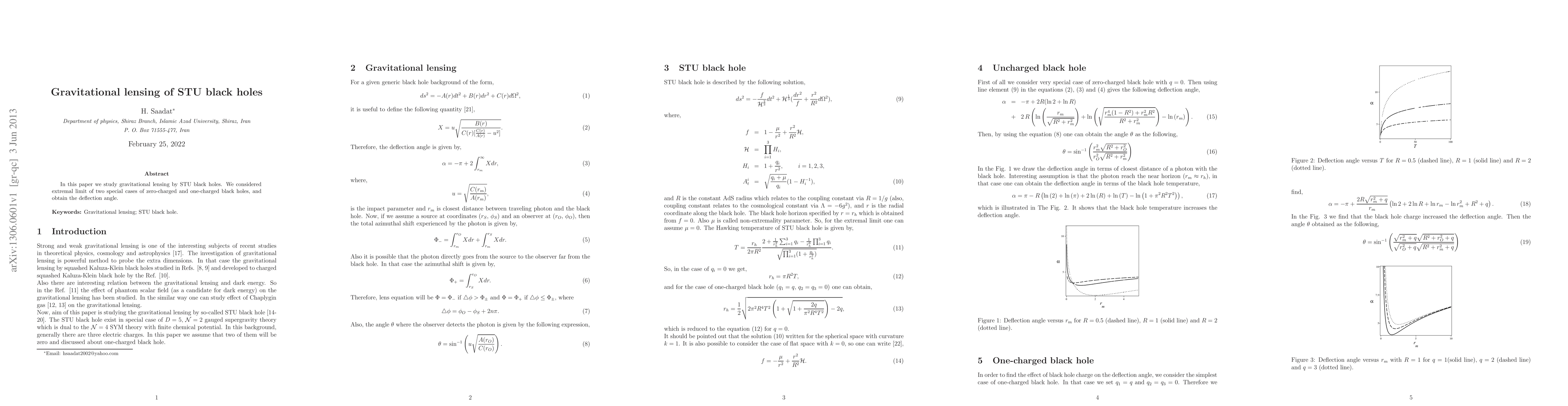 Summary: This paper investigates gravitational lensing by STU black holes, focusing on extremal zero-charged and one-charged cases. It finds that the presence of charge in the black hole enhances the deflection angle.