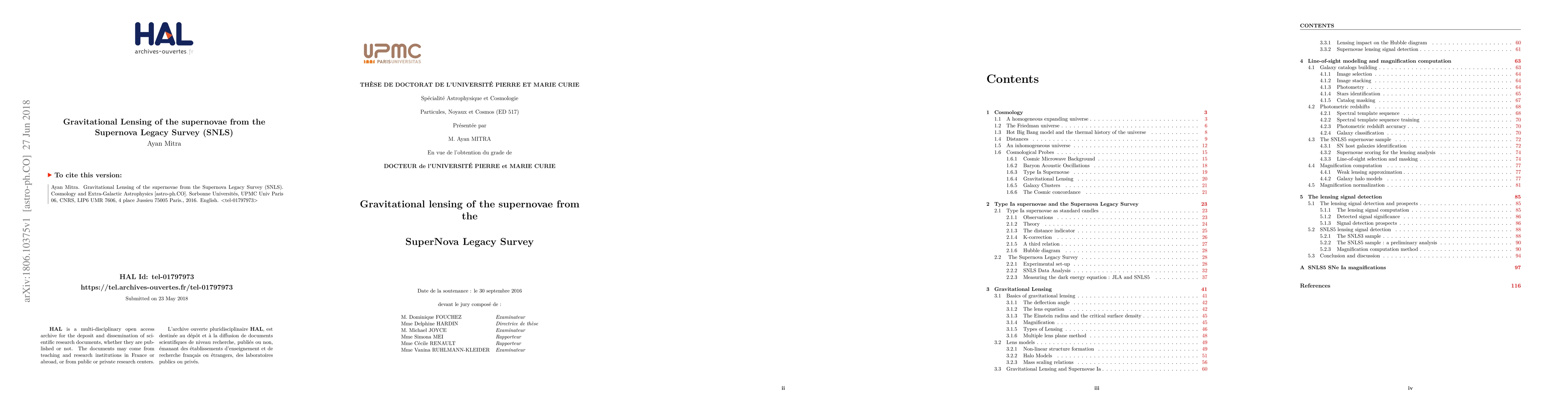 The presence of mass inhomogeneities along the line of sight of propagation of light fromdistant objects can induce deflection in the flight path of the photon. This phenomenon is called as gravitational lensing. Lensing can have both distortion (shear) and isotropic magnification effects on the source. We studied the effect of lensing magnification on supernova (SN) Ia in this thesis. Presence of lensing would introduce a source of contamination to the brightness distribution of the source (SN Ia in our case). Thus it also enables one to compute the lensing effect indirectly from the Hubble diagram (i.e. from the residual to the Hubble diagram). In this thesis we computed the correlation between these two effects : the Hubble residual and the computed lensing magnification for the SN by the line of sight foreground dark matter haloes. A detection of positive correlation between these two would signify the positivity of lensing signal detection. The data sample is the spectroscopic SNe Ia sample from the five years full SNLS data and the Hubble residuals are those of the preliminary cosmology analysis performed on SNLS5 data. We obtain a signal of \rho = 0.177 at 2.51 \sigma. This result is consistent with the previous SNLS three years data lensing analysis results.