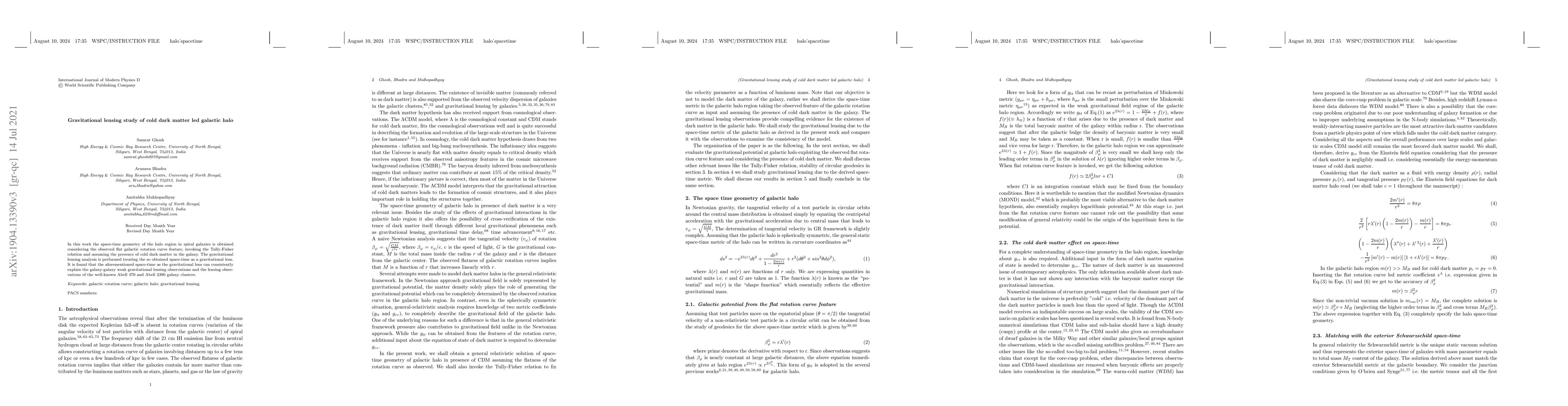 This study investigates the space-time geometry of galactic halos in spiral galaxies using gravitational lensing, assuming cold dark matter and the Tully-Fisher relation. The analysis reveals that the derived space-time geometry can explain both galaxy-galaxy weak lensing and the lensing of the Abell 370 cluster.