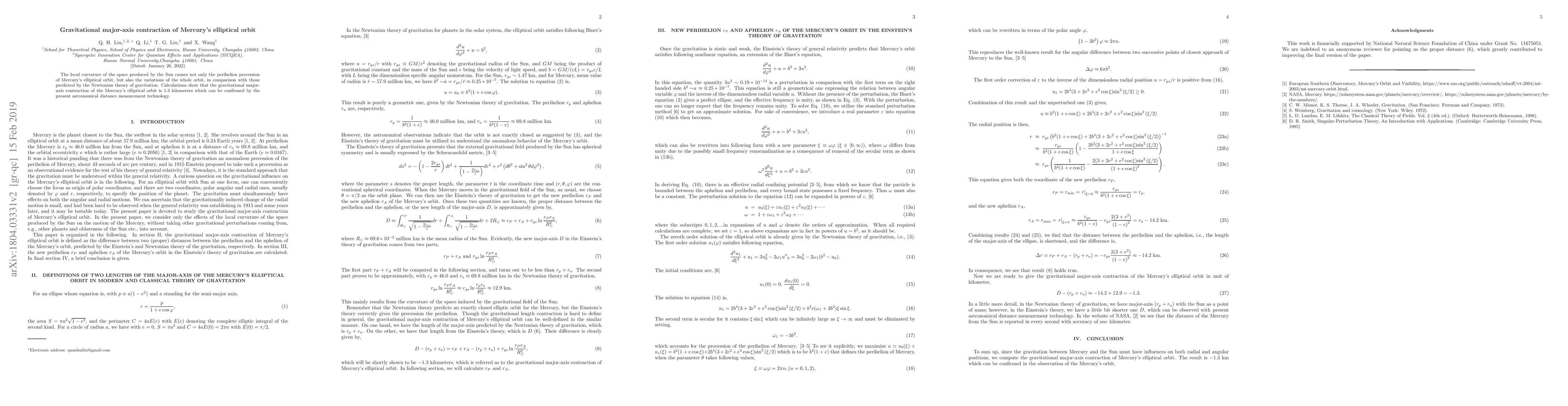 The local curvature of the space produced by the Sun causes not only the perihelion precession of Mercury's elliptical orbit, but also the variations of the whole orbit, in comparison with those predicted by the Newtonian theory of gravitation. Calculations show that the gravitational major-axis contraction of the Mercury's elliptical orbit is 1.3 kilometers which can be confirmed by the present astronomical distance measurement technology.